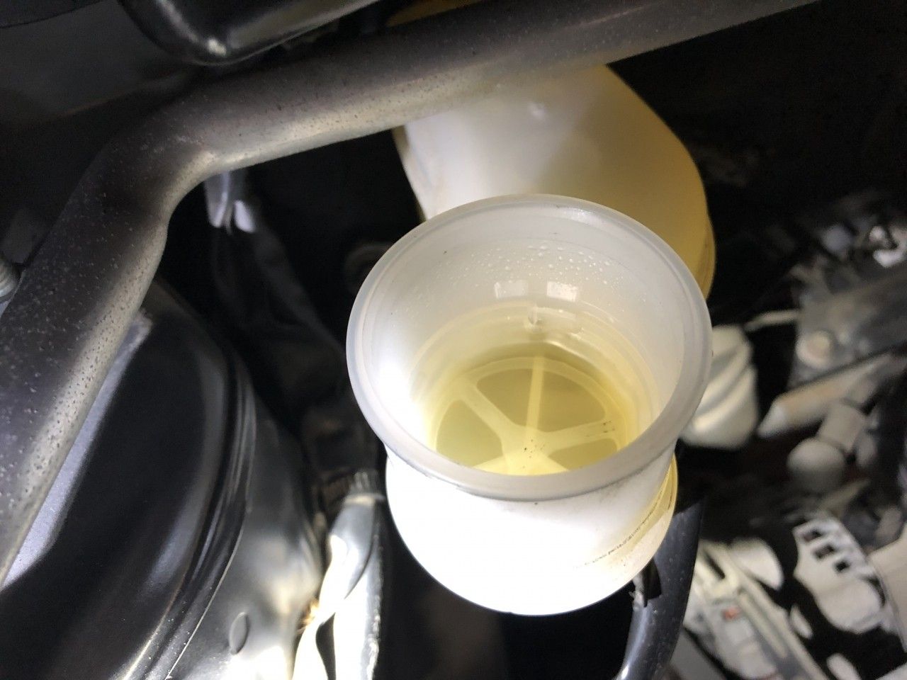 エンジンクーラントはクーラントが暖まるとリザーバータンクに戻り量が増える構造の為、エンジンを完全に暖機した後に、FULL近くになる様に補充を行いました。