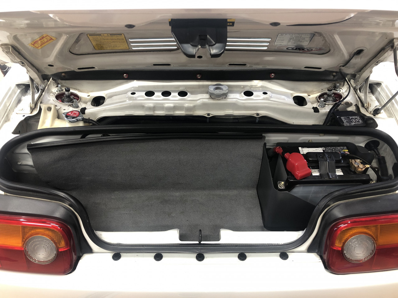 メンテナンスリッド下側の固定ブラケット部分は、トランクフードから入ってきた水が溜まり易く、状態が良い車両でも錆が発生していることがある部分ですが、本車両は錆が無く綺麗です。