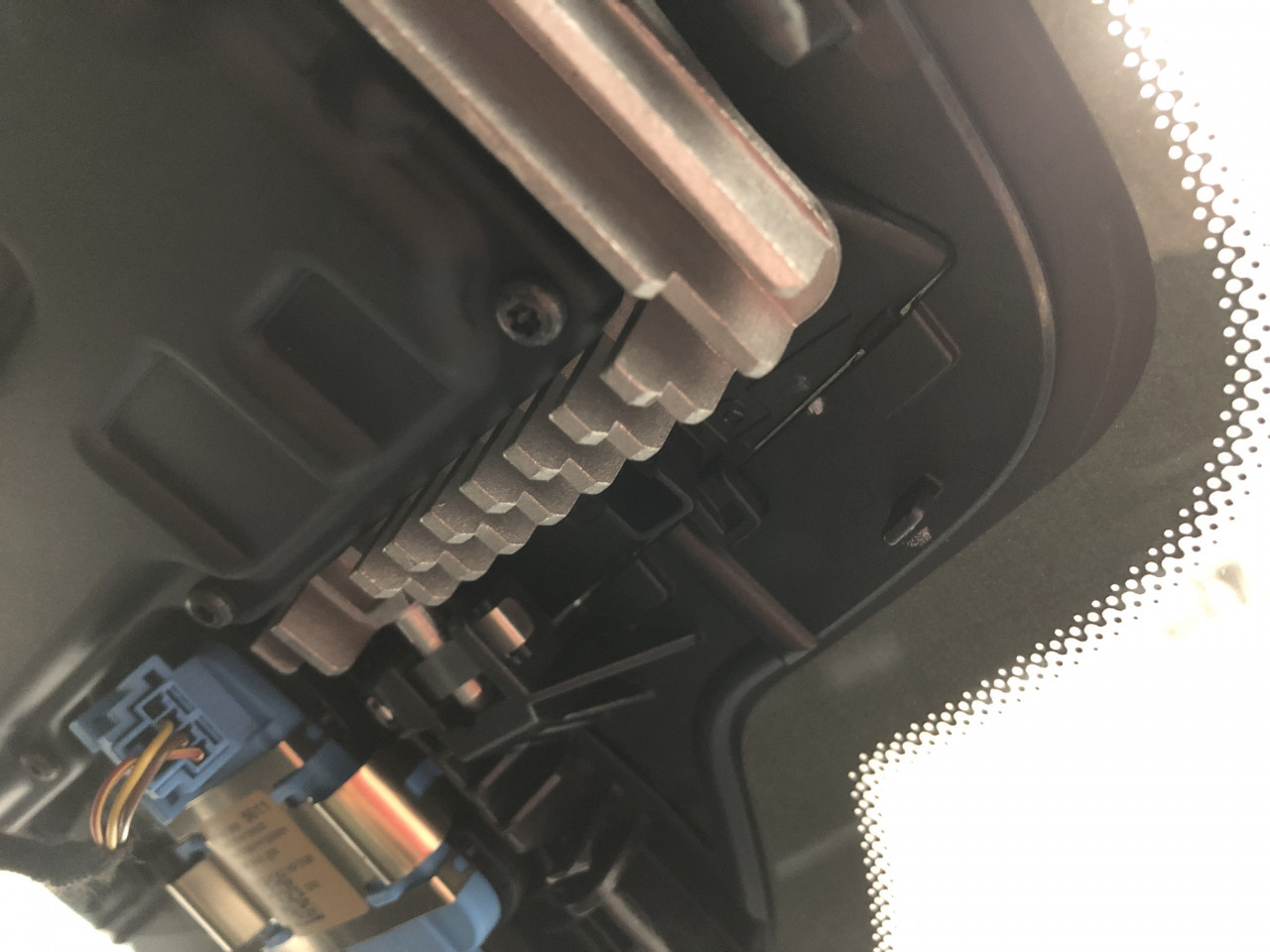 そこで、よ~く観察すると、運転席側ADASユニットの裏側に音の発生しそうな可動式のカバーがあり、手で押さえると少しカタカタ動きます。
