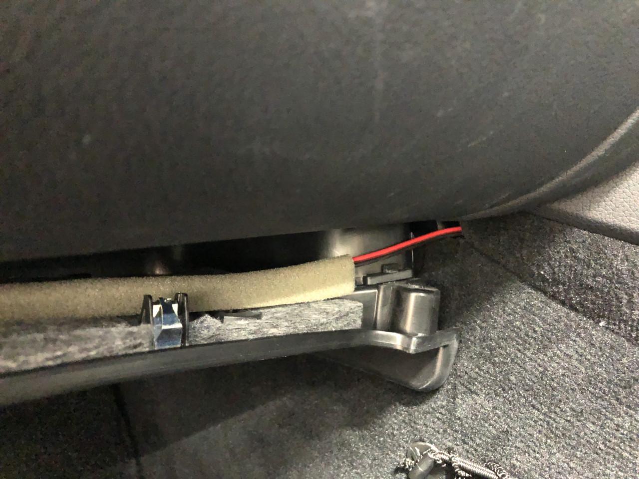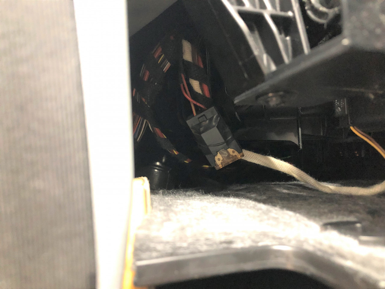 この部分に関しては一部最初から異音処理がされておりましたが、ドラレコのヒューズが樹脂部分に当たっていたり、センターコンソール内部へ続く部分は配線が裸のままで、恐らくダッシュボード下から聞こえていた異音はこの2カ所によるものだと考えられます。