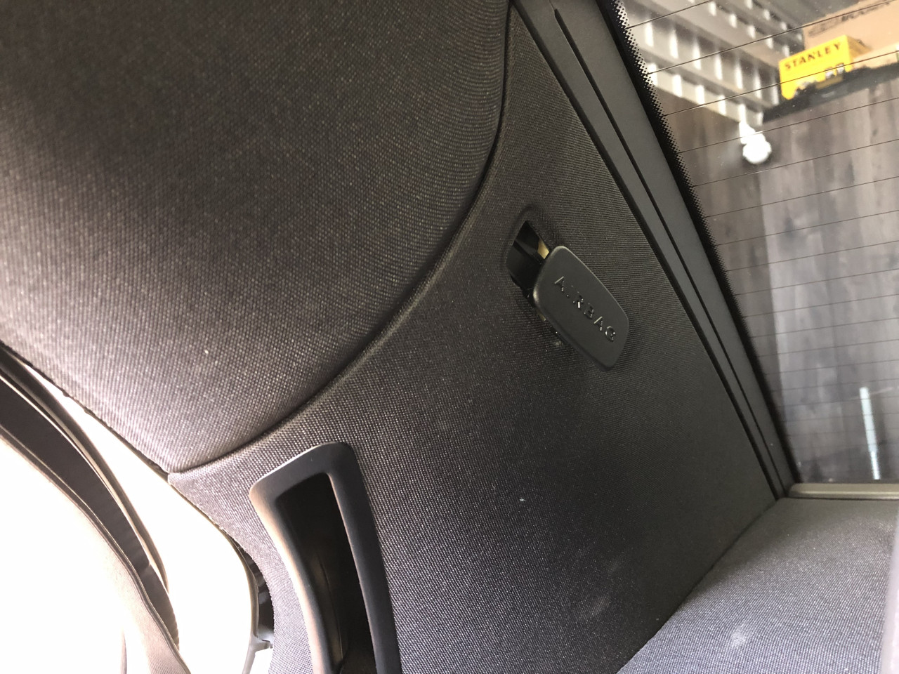 とにもかくにも、ルーフパネルを確認する必要がありますので、ルーフライニングを下にズラしてアクセスするために、周辺パーツを外していきます。