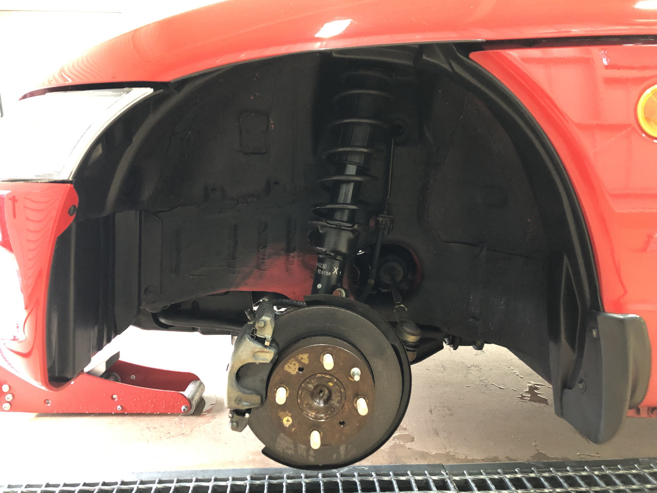 では、早速、運転席フロントからホイールを外してホイールハウス内の確認及び清掃を行って参ります。
