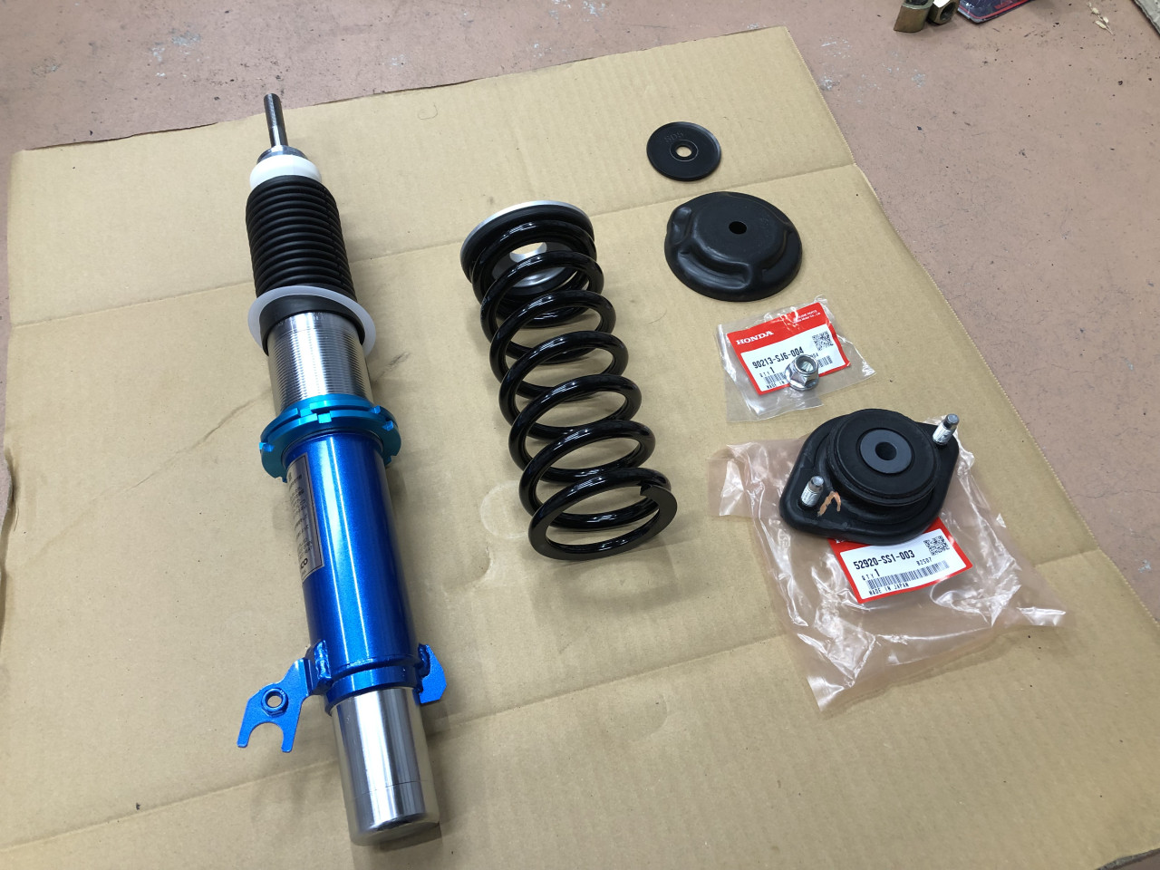 純正サスペンションを取り外しましたら、クスコ製の車高調整式サスペンションを組付けて、車体に取り付けます。