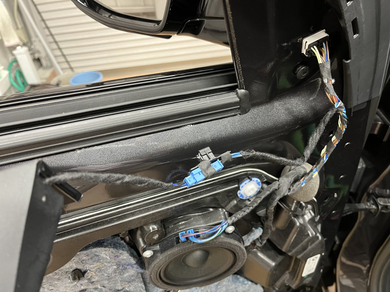 ドアライニングが外れましたら、まずはドアパネル側を確認致しますが、ツイーターの純正配線が裸のままであることが確認でき、これが前側から聞こえてきた異音の原因と考えられますので対策を行います。