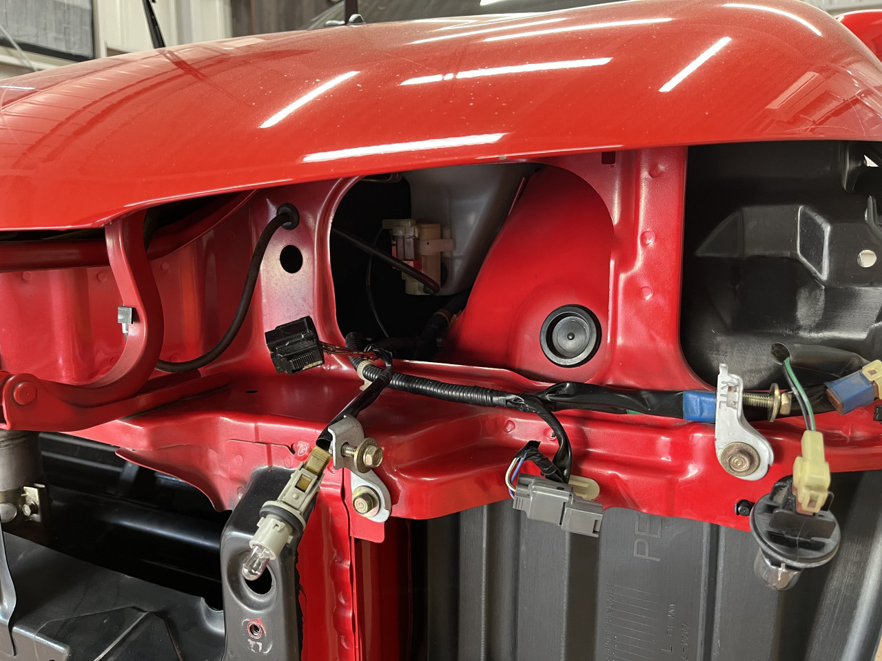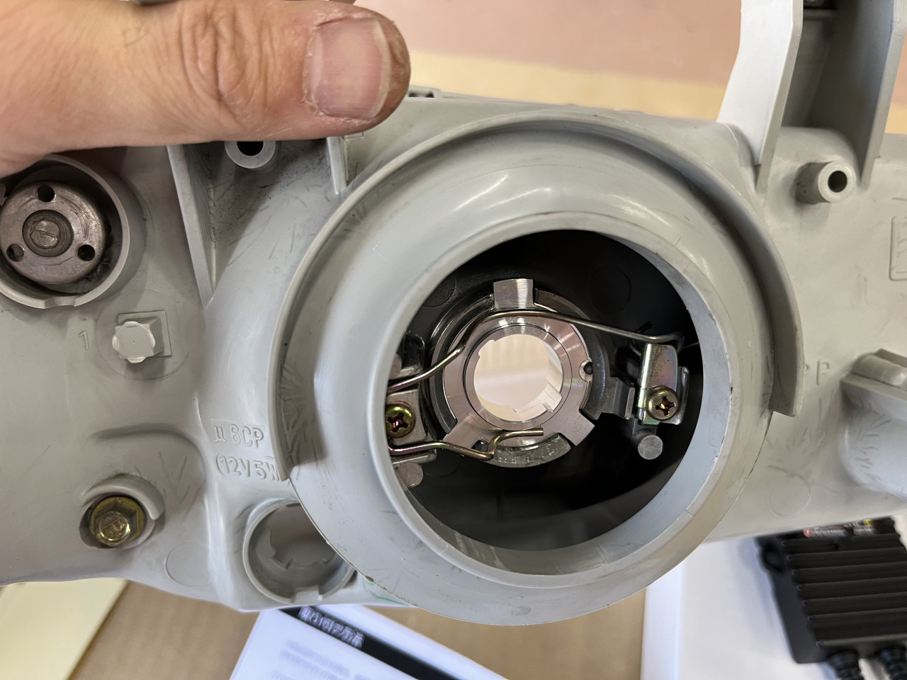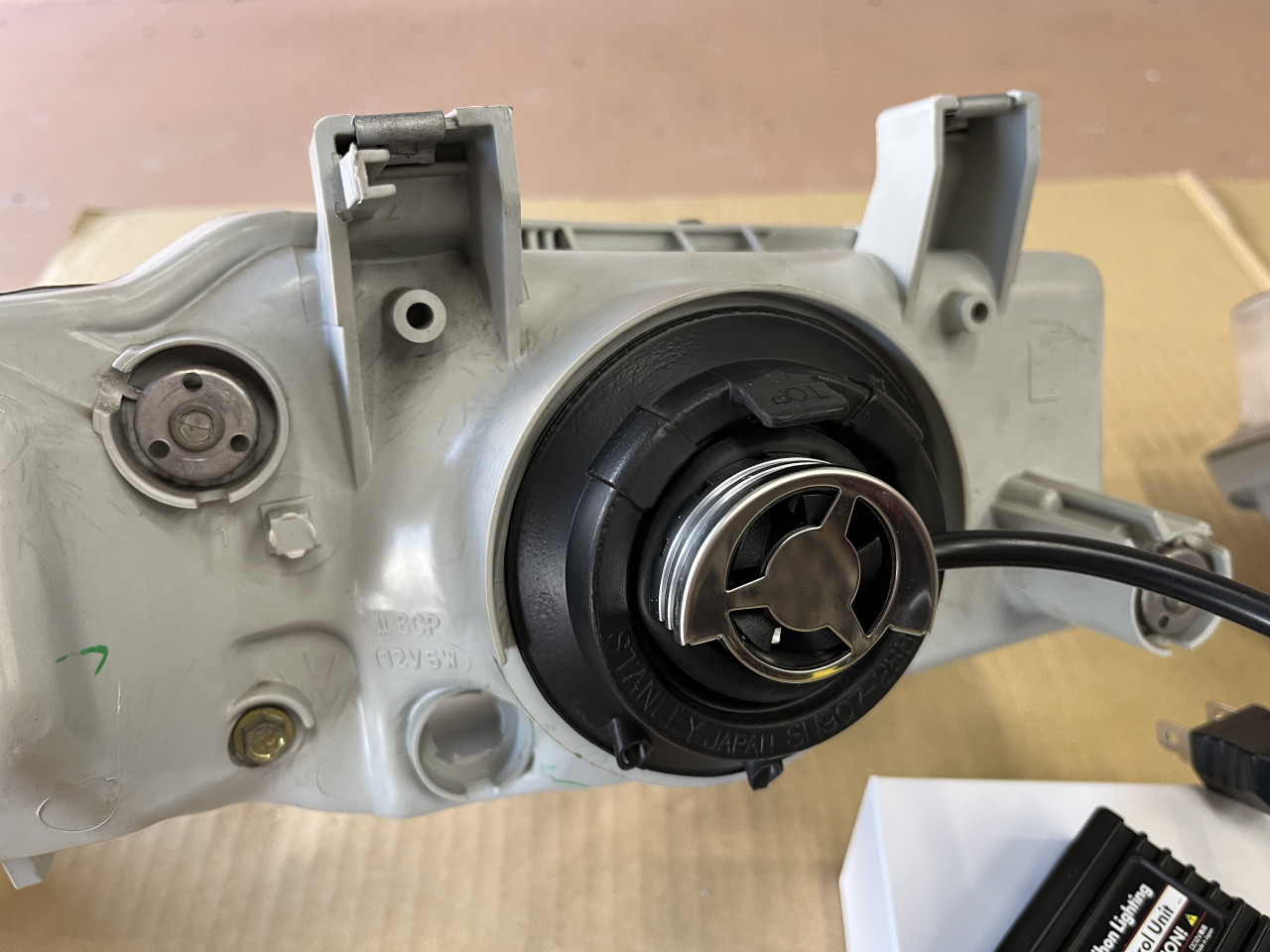 清掃が完了致しましたら、ヘッドライトASSYを車両に仮固定して、LEDヘッドライトバルブの3曲カプラーを車体側ハーネスに挿入し、点灯を確認します。