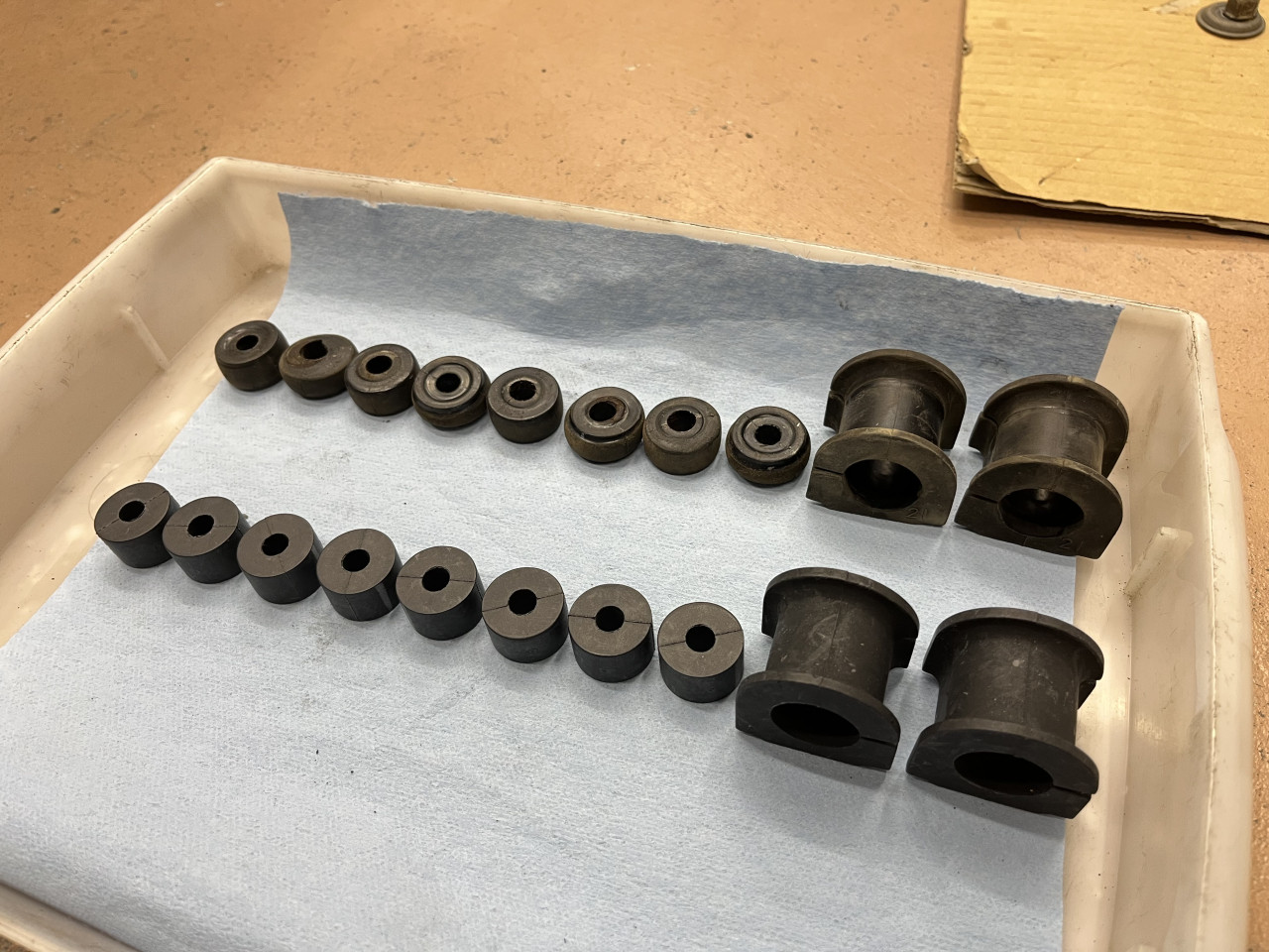 これで、今回交換するブッシュが全て外れましたので、新品のブッシュ(下側)と古いブッシュ(上側)を並べてみますと、古い方は特にスタビライザーラバーAが硬くなり変形してしまっていることが確認頂けるかと思います。