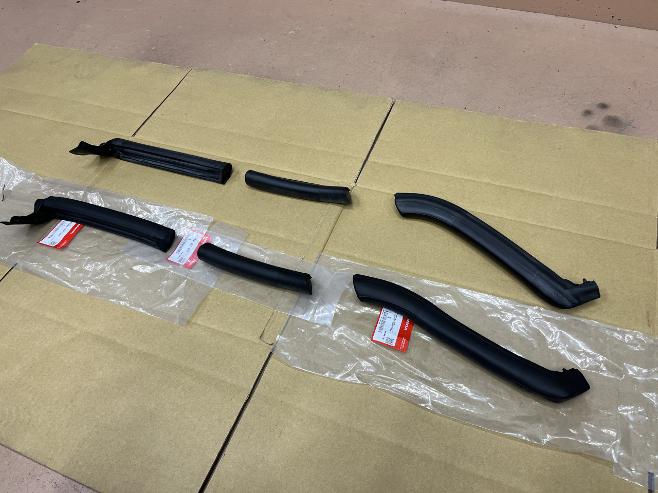 尚、BEATにおけるウェザーストリップはフロントピラー部分が1ケ、幌サイドの部分が片側3ケ(両側で計6ケ)のパーツで構成されており、今回はもちろん全ての部分を交換致します。