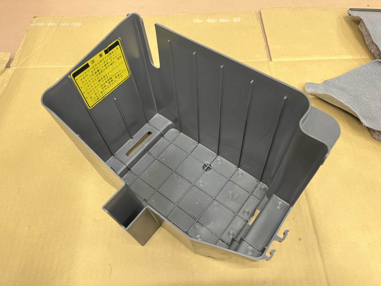 清掃を行うにあたっては、隅々まで綺麗にする為、そしてボディーのトランクフロア状態確認を行う為に、トランクマット、バッテリー、バッテリーケース、助手席側テールライトカバーなど全て取り外してから行います。