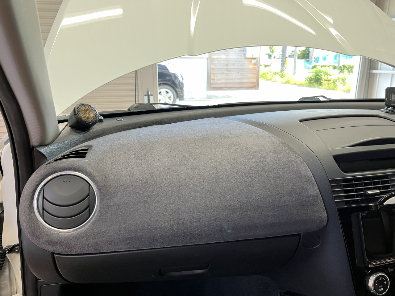 加えて、RX-8で良く見られる助手席側ダッシュボードのエアバックカバーのヒビ割れですが、本車両はシートやドアライニングなどのグレーカラーとコーディネートされたスエードが綺麗に張り付けられており、ヒビ割れは目立たない状態となっております。
