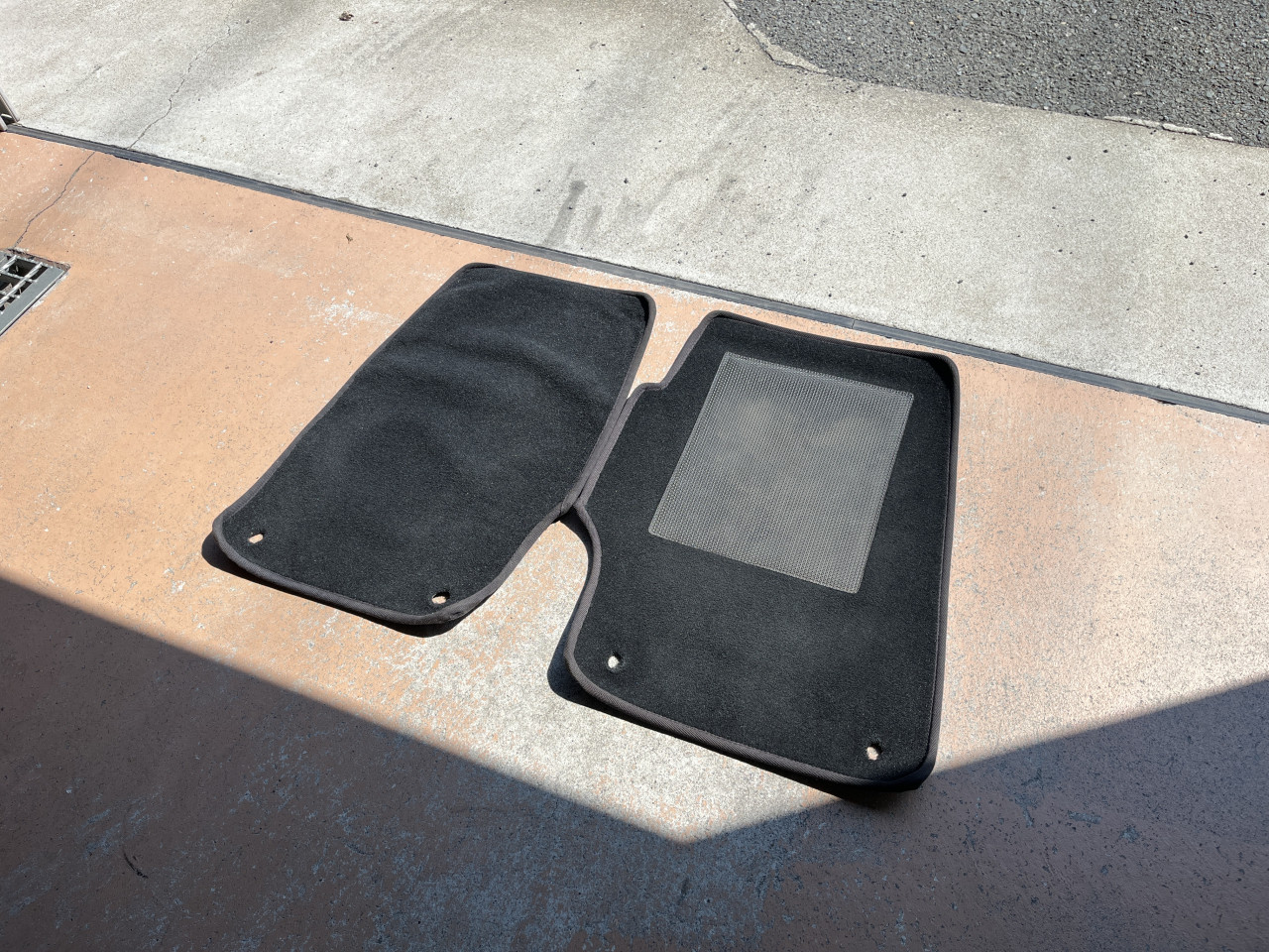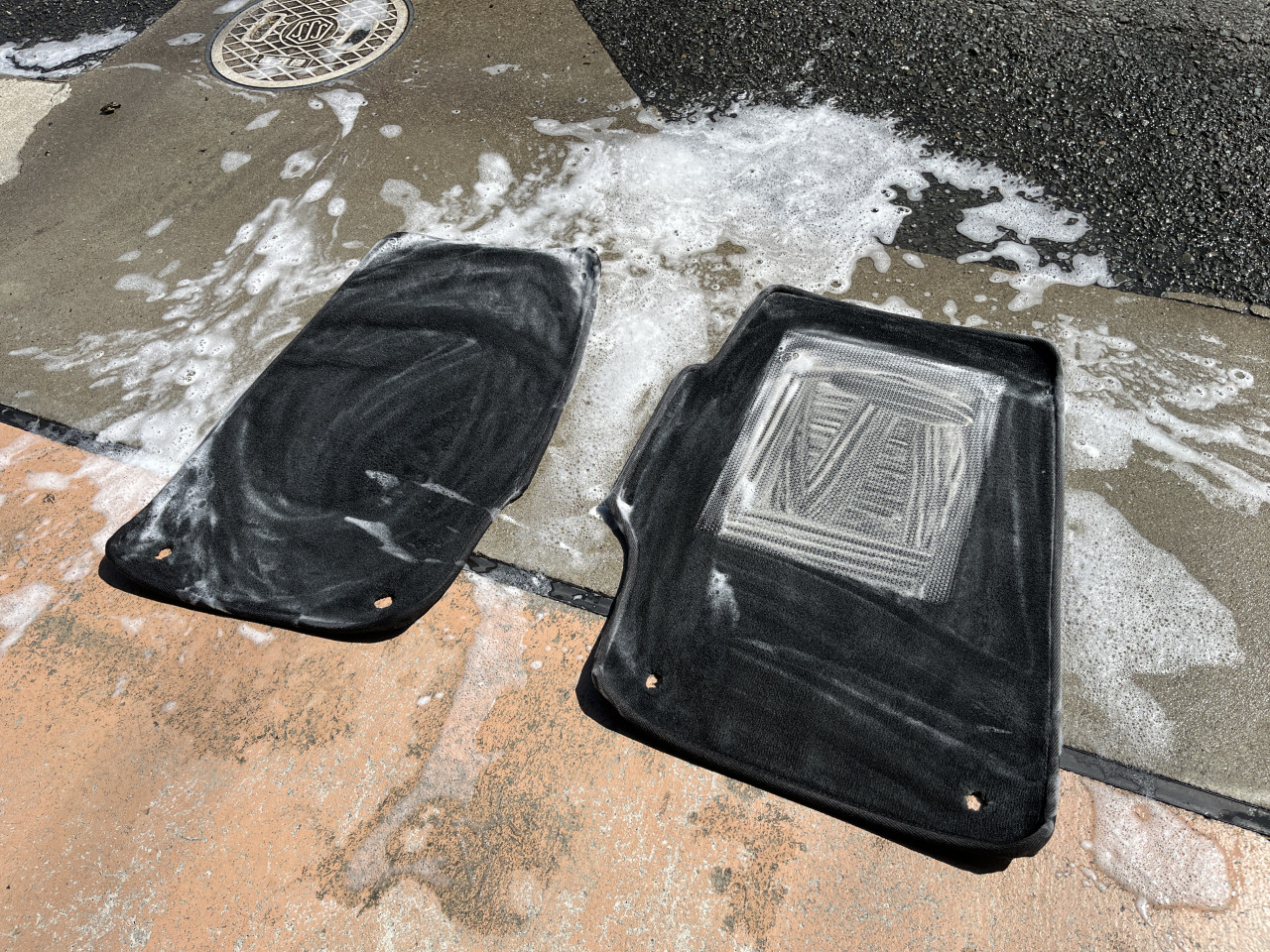 では早速作業のご紹介に入りますが、内装清掃におけるはじめの作業としまして、フロアマットを車両から取り外し、柔らかいブラシと洗剤を用いて汚れが落ちるようにしっかりと洗っていきます。