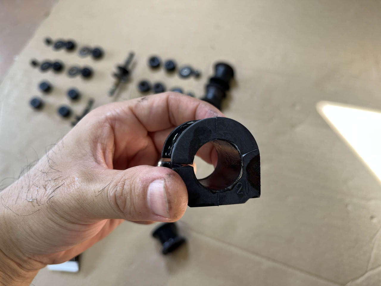 そして、スタビライザーブッシュをスタビライザーに装着してブラケットと共に車体に取り付け、スタビライザー両端のスタビライザーボルトとスタビライザーラバーAも取り付けます。