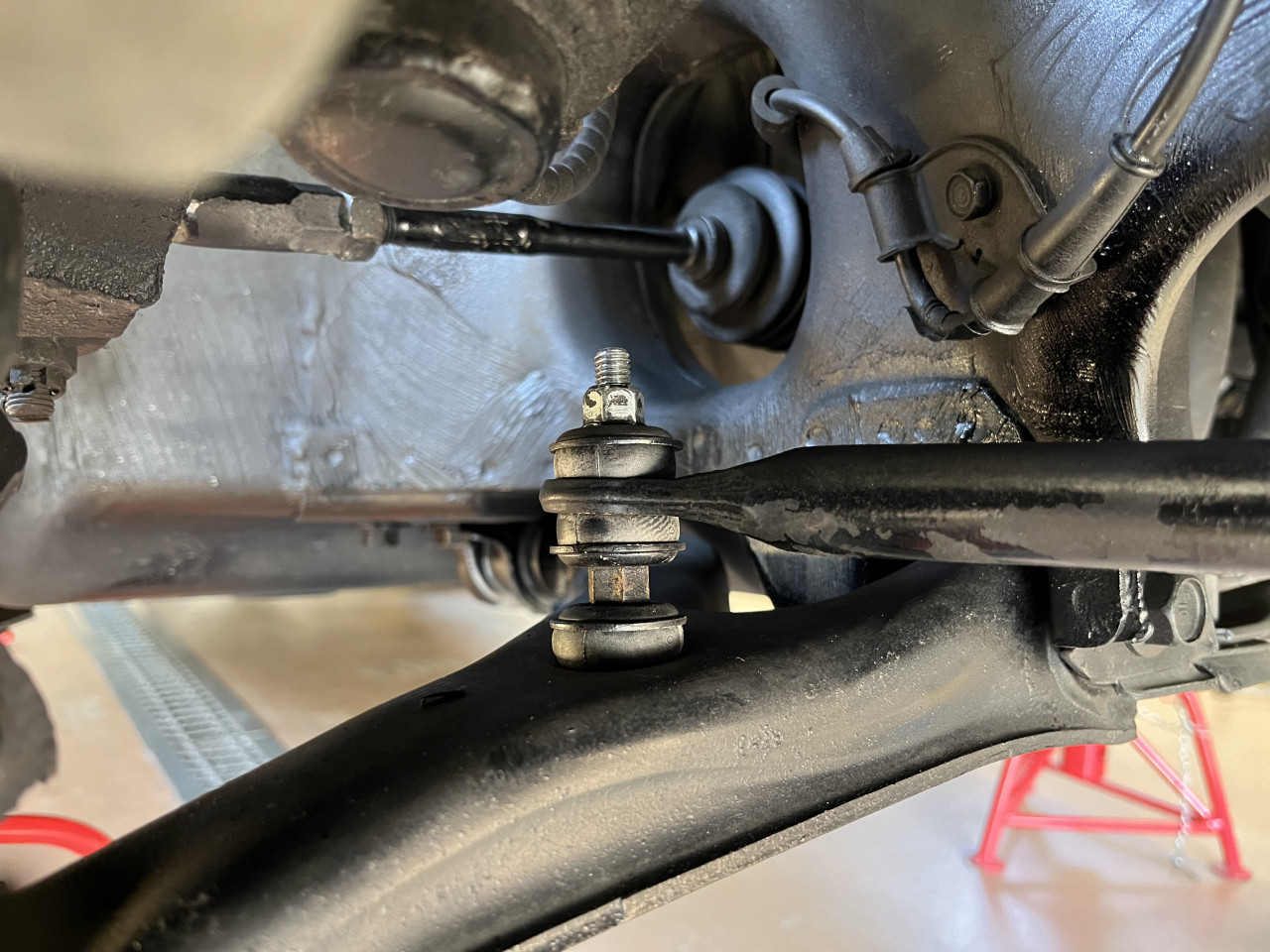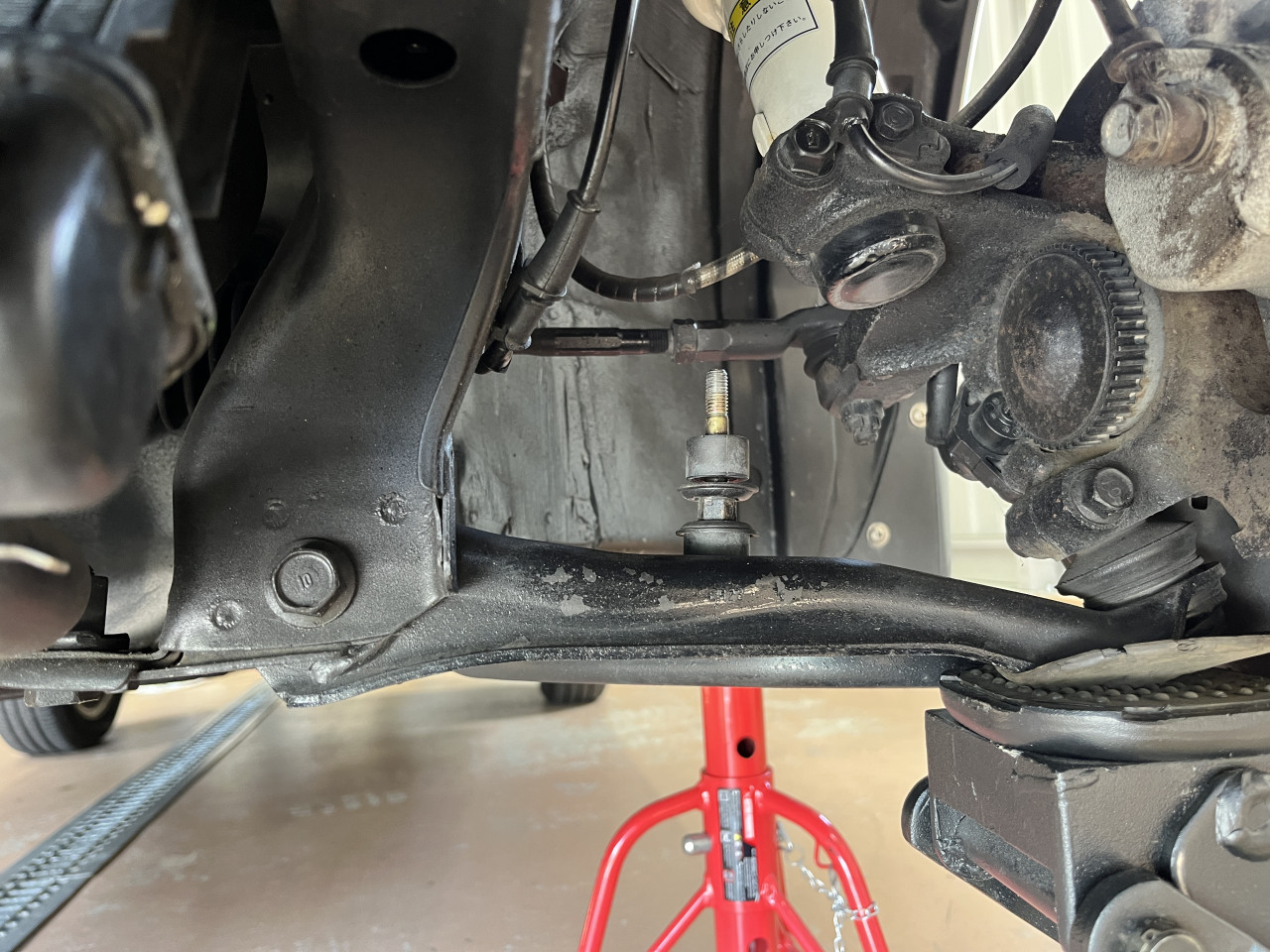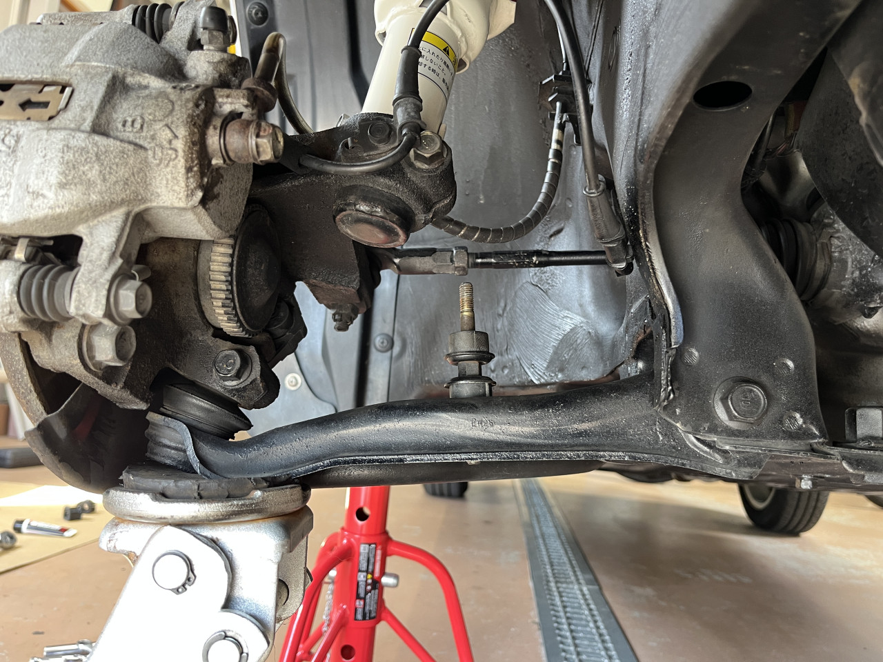 アンダーカバーが外れましたら、フロントロアアームに固定されているスタビライザーボルトの両端にあるセルフロックナットを緩め、スタビライザーラバーAとスタビライザーボルトを車両から外して、スタビライザー両端をフリーにします。