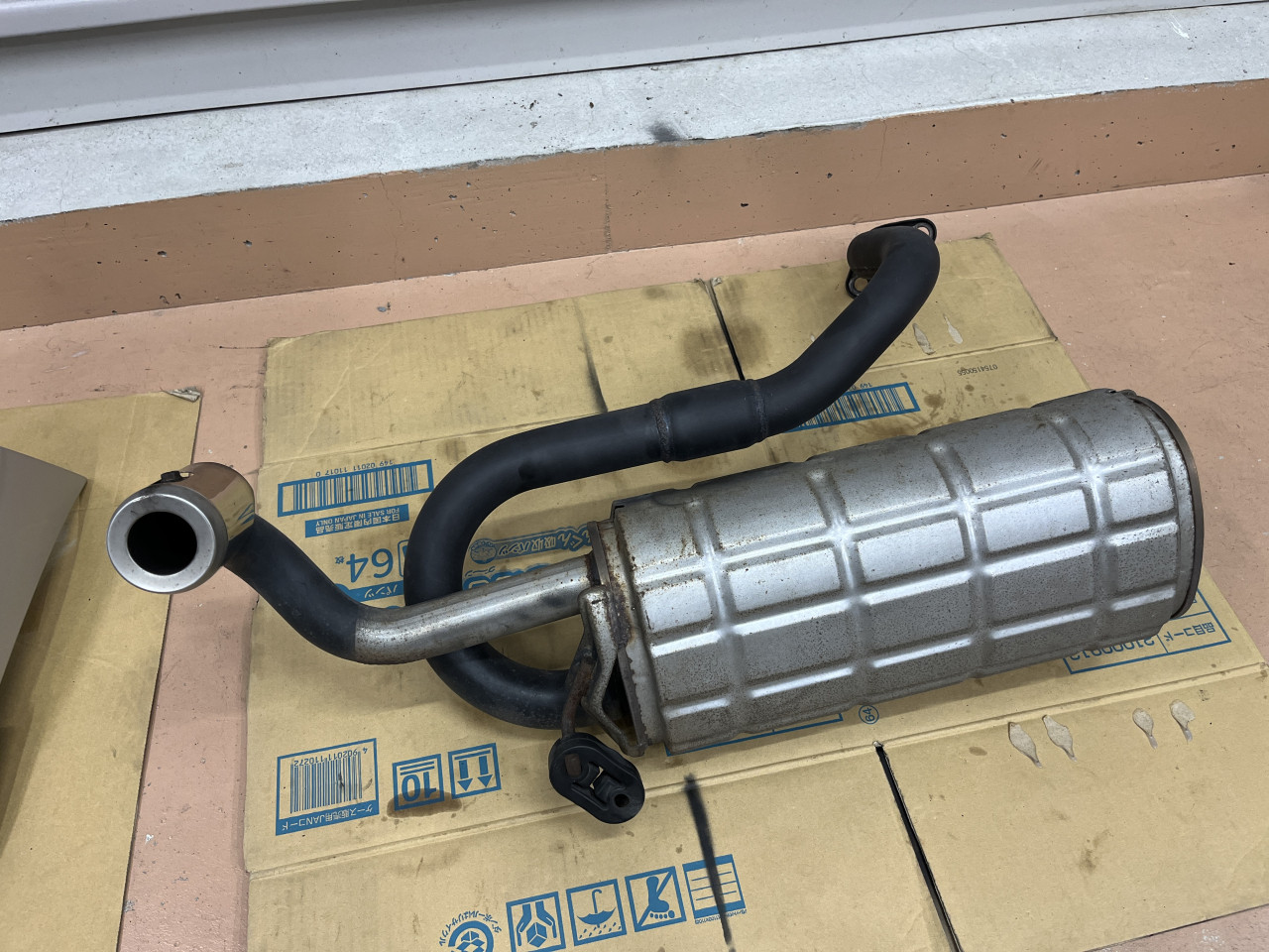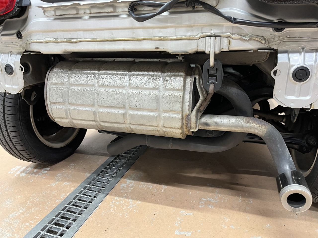 では早速交換作業のご紹介に入りますが、まずはリアバンパーを取り外し、触媒と固定されているボルト2本を緩め、純正マフラーを取り外します。