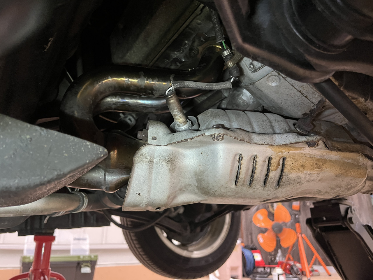マフラーが外れましたら、排気温度センサーとO2センサーのカプラーを外し、車体に固定されているステーのボルト2本、純正エキマニと固定されている3個のナットを緩め、触媒を取り外します。