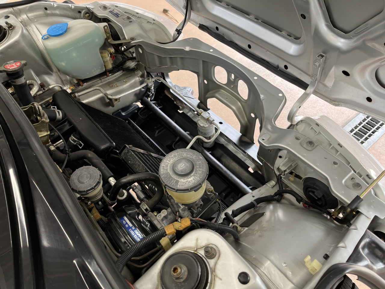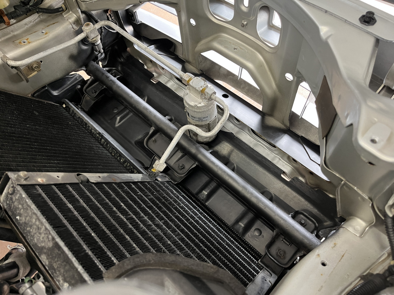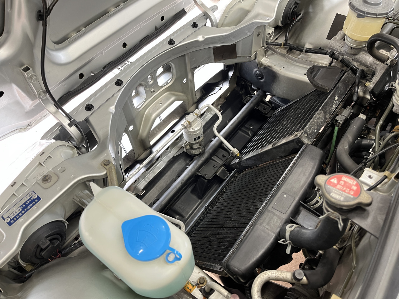 各部綺麗になりましたら各部状態確認を行いますが、フレームはもちろんのこと、フロントクロスビームやラジエター、コンデンサー、エアコンレシーバータンクなどの錆が少ないことが確認でき、予想通り状態の良いフロントボンネット内であることが確認できました。