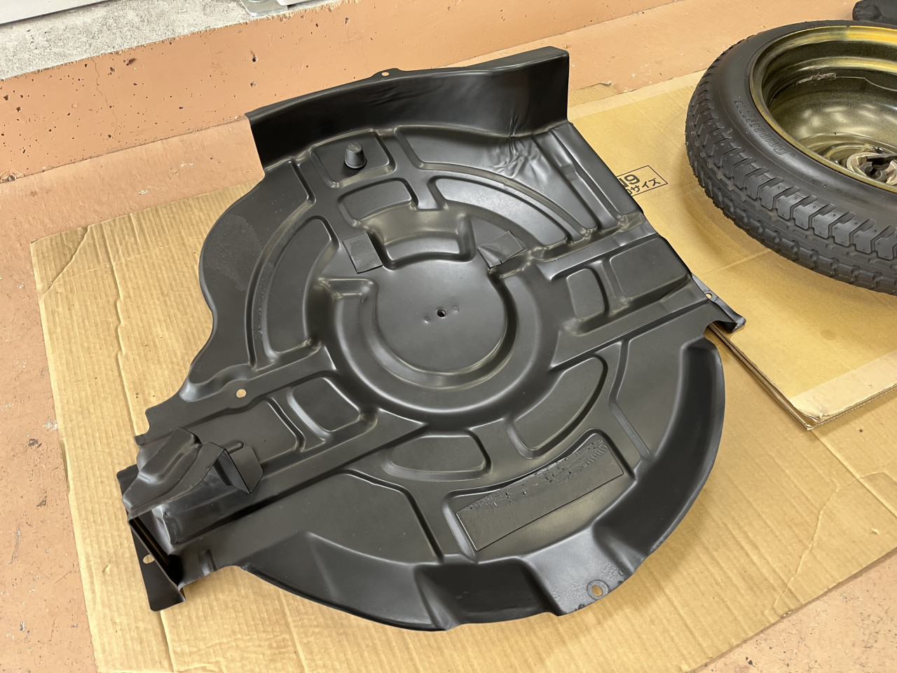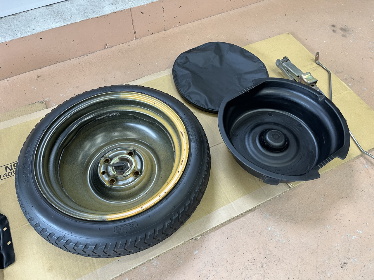 フロントボンネット内の各部の清掃が終わりましたら、取り外したスペアタイヤフロアパンやフロアジャッキ、スペアタイヤ、純正OPのスペアタイヤバケットなども綺麗に清掃しておきます。