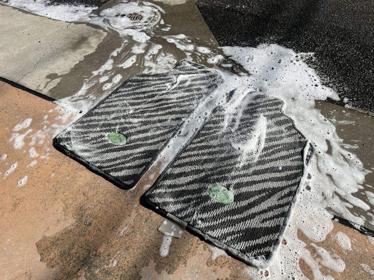 洗剤で清掃した後、マットが柔らかい質感となる様に柔軟剤で仕上げた上で、表裏共に高圧洗浄機で良く洗い流して、太陽のもとで乾かします。