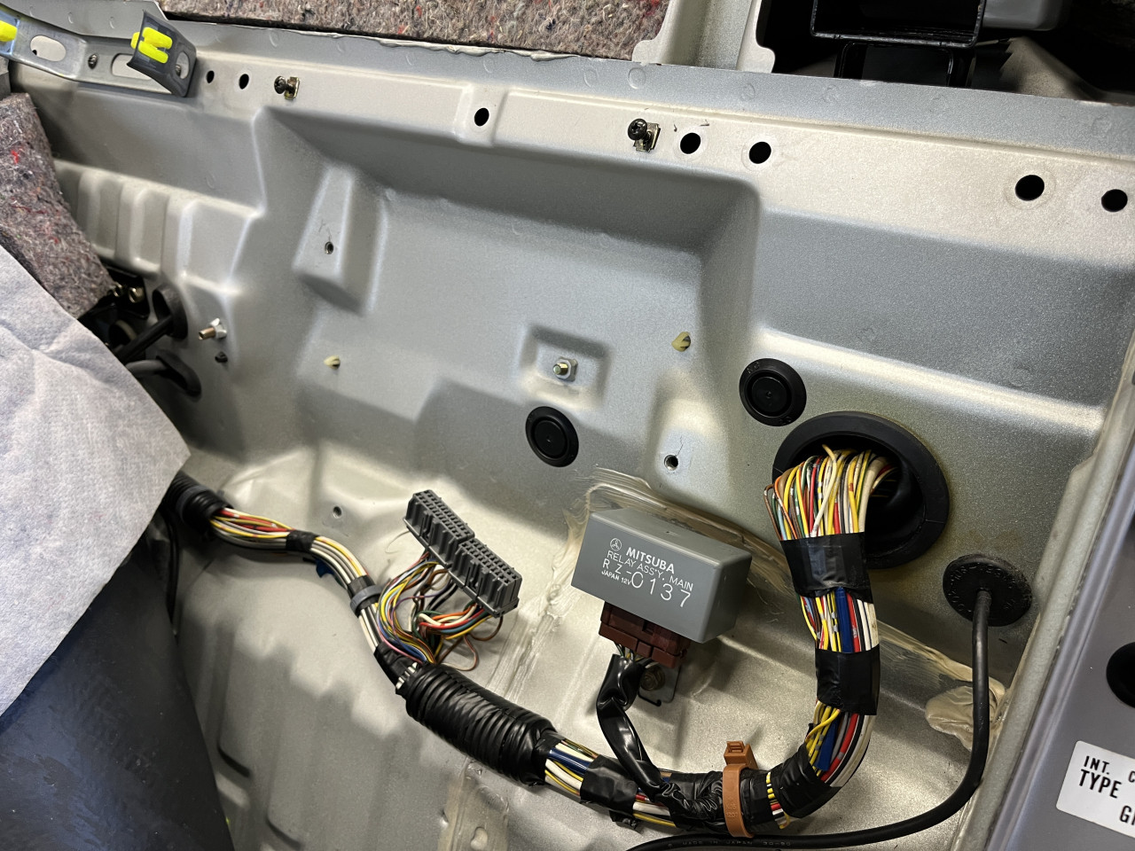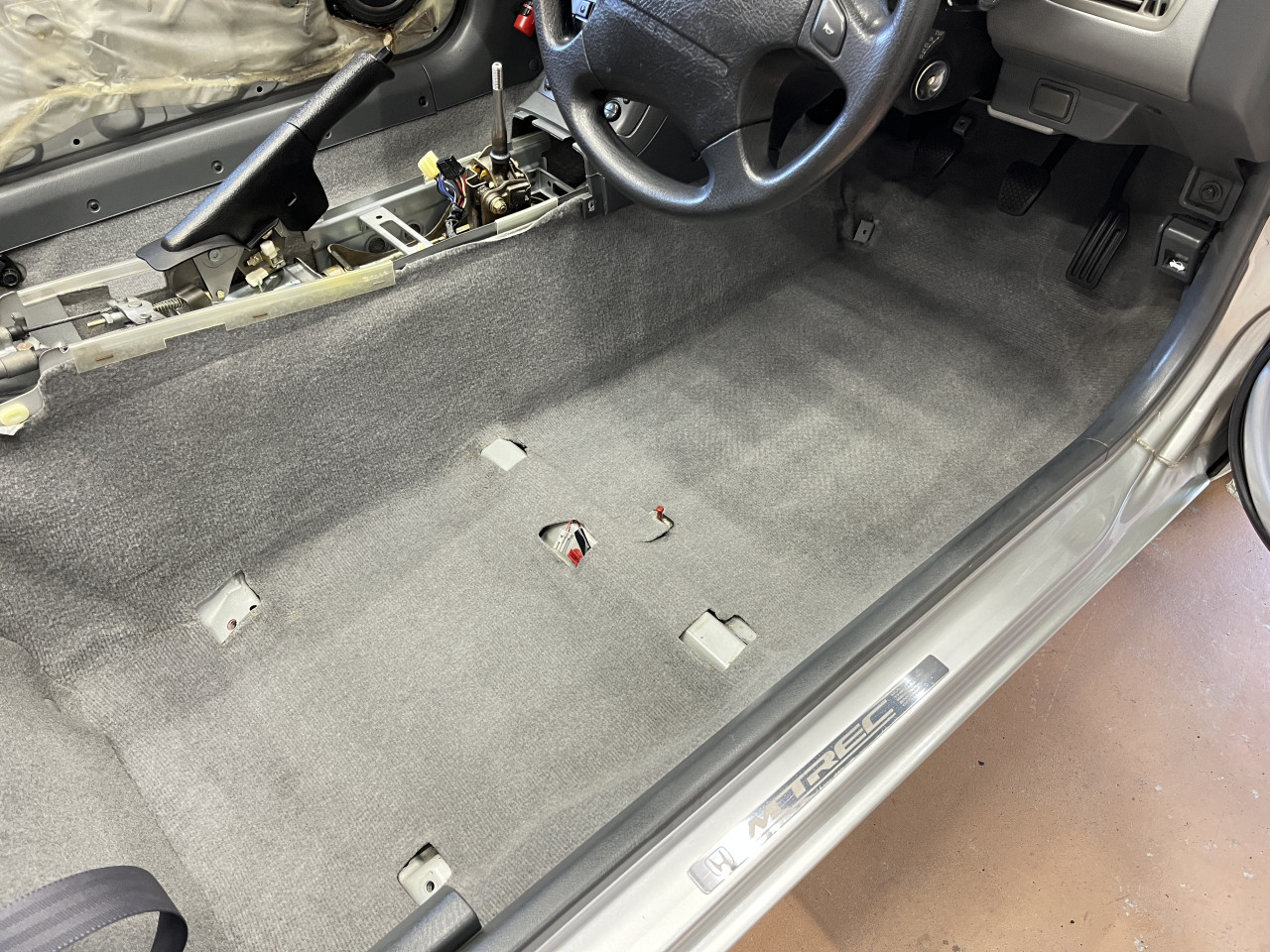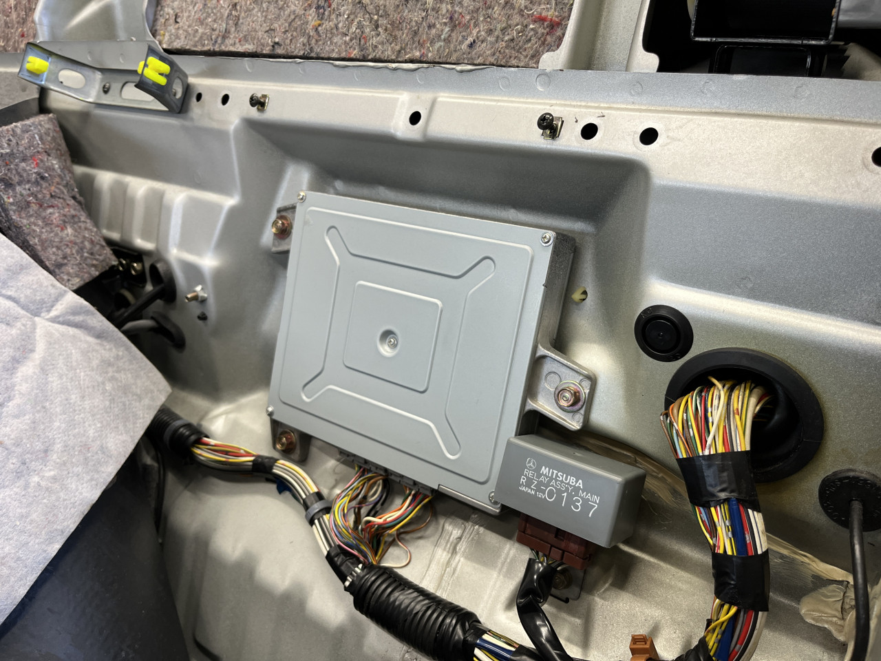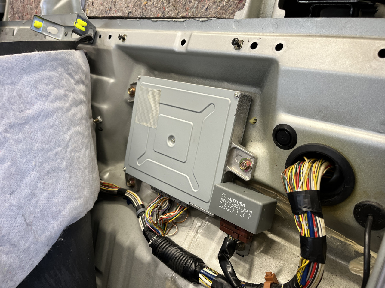 ECUは助手席後ろドキュメントBOX裏側のカーペット裏にあるため、カーペットを剥がしてECUにご対面です。