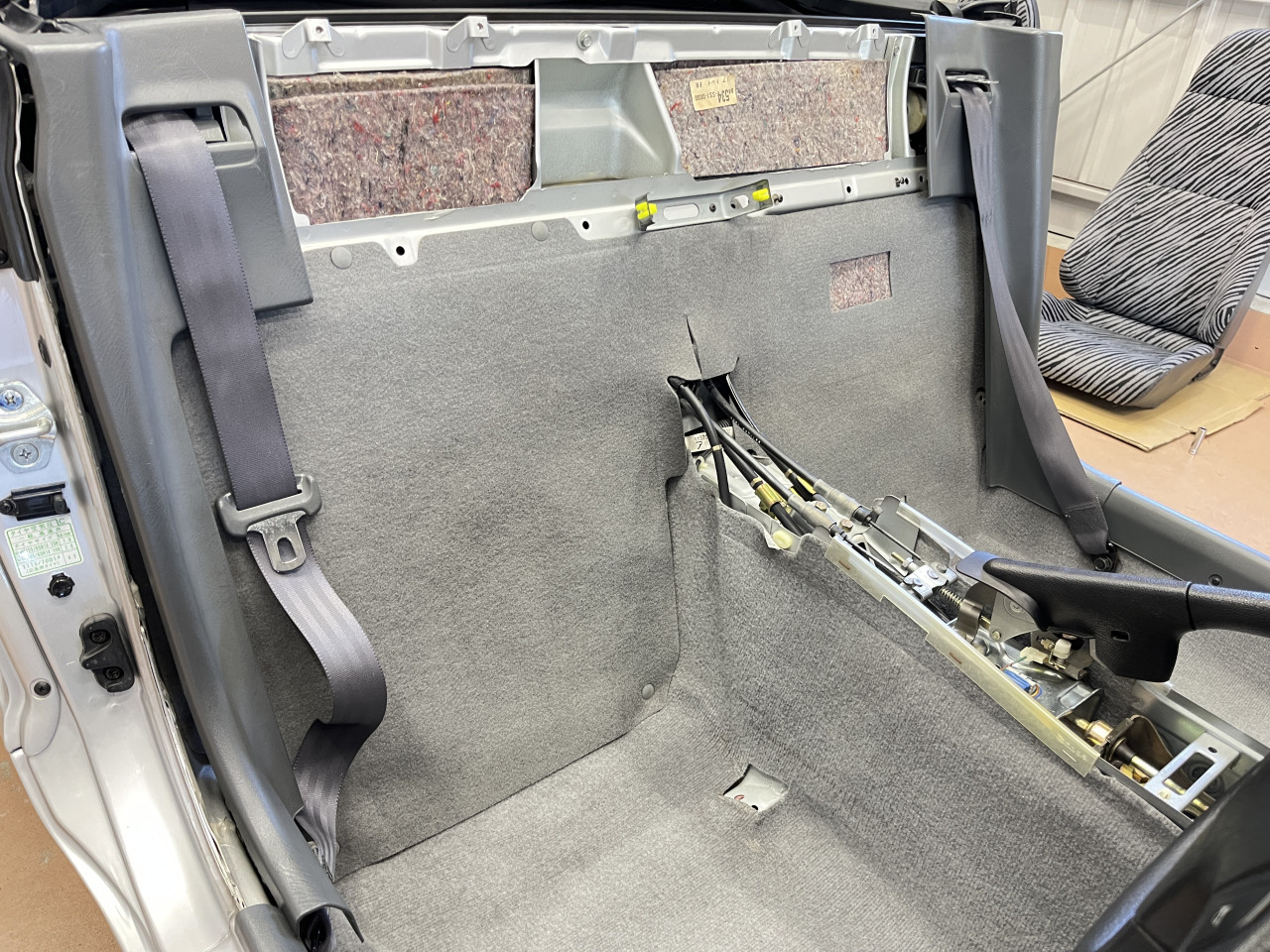 この状態で、ボディーの錆やフロアカーペットの状態などを確認致しますが、カーペットにシミや汚れも無く(シミなどがあるとフロアから水が入ってきている可能性があるので要注意です)、本車両は清掃前でも綺麗な状態が保たれております。