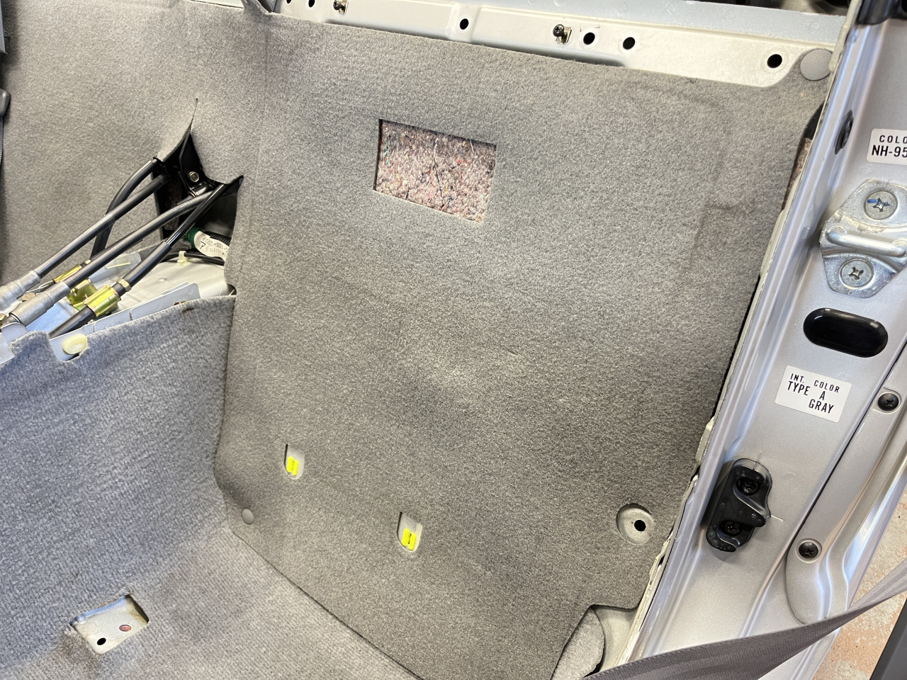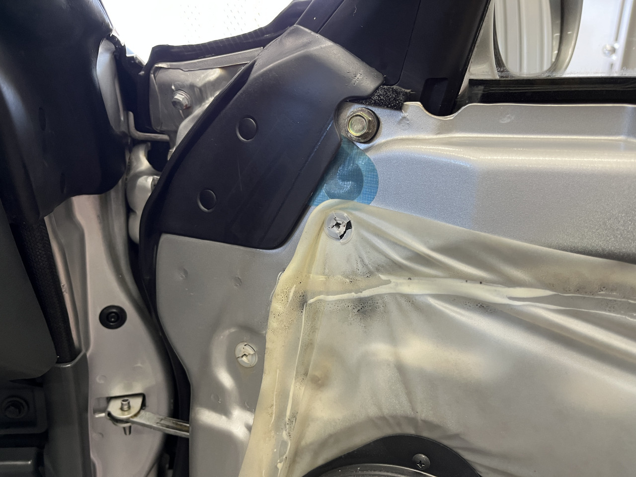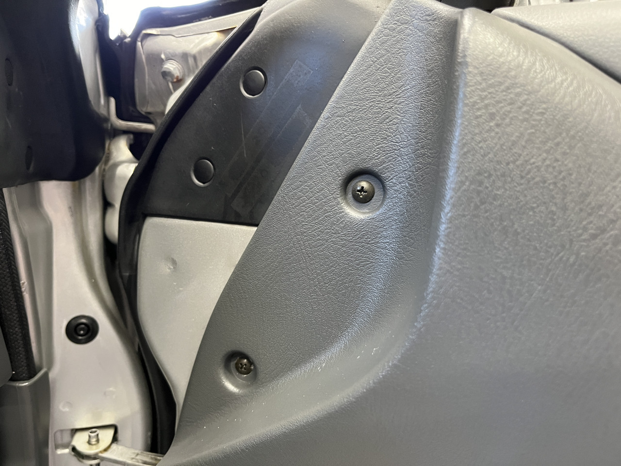 BEATではドアライニングの前側をビス2ケで固定しておりますが、そのビスのグロメットが未交換の場合、ほぼ間違いなくボロボロに割れてしまっております。