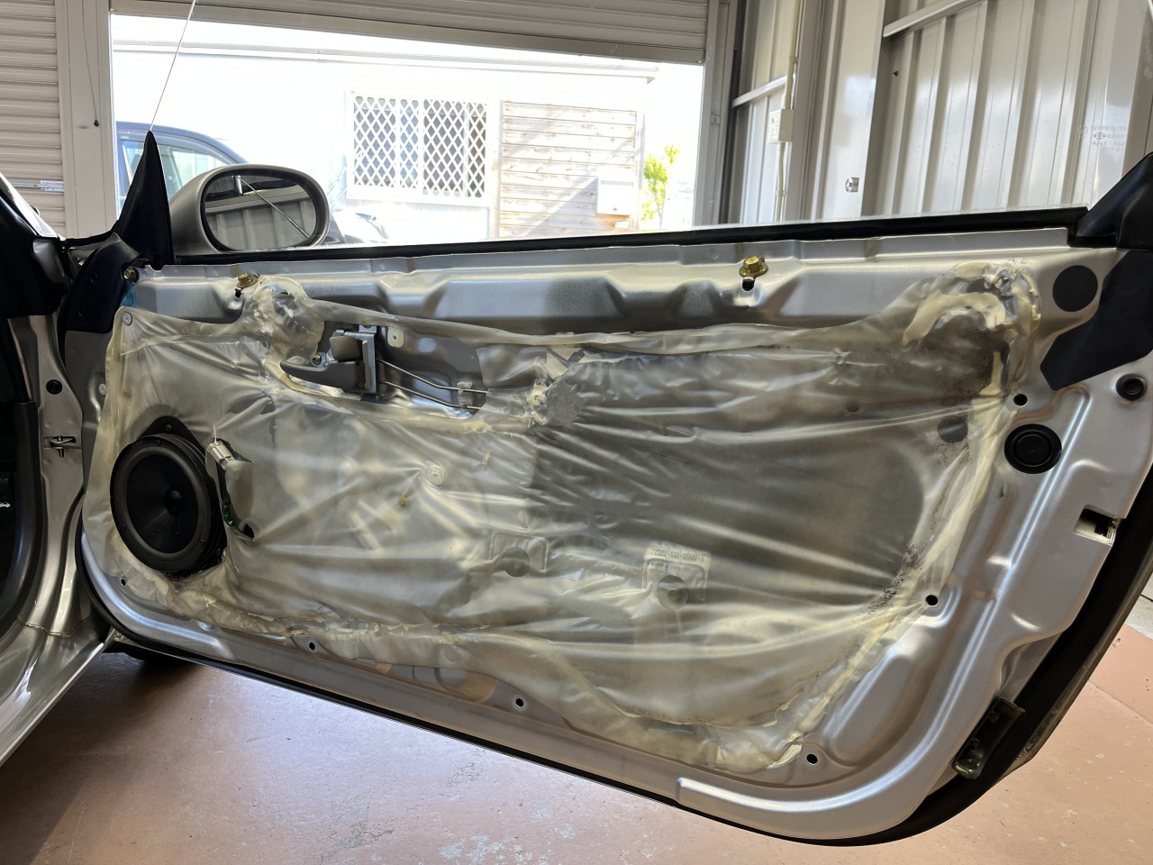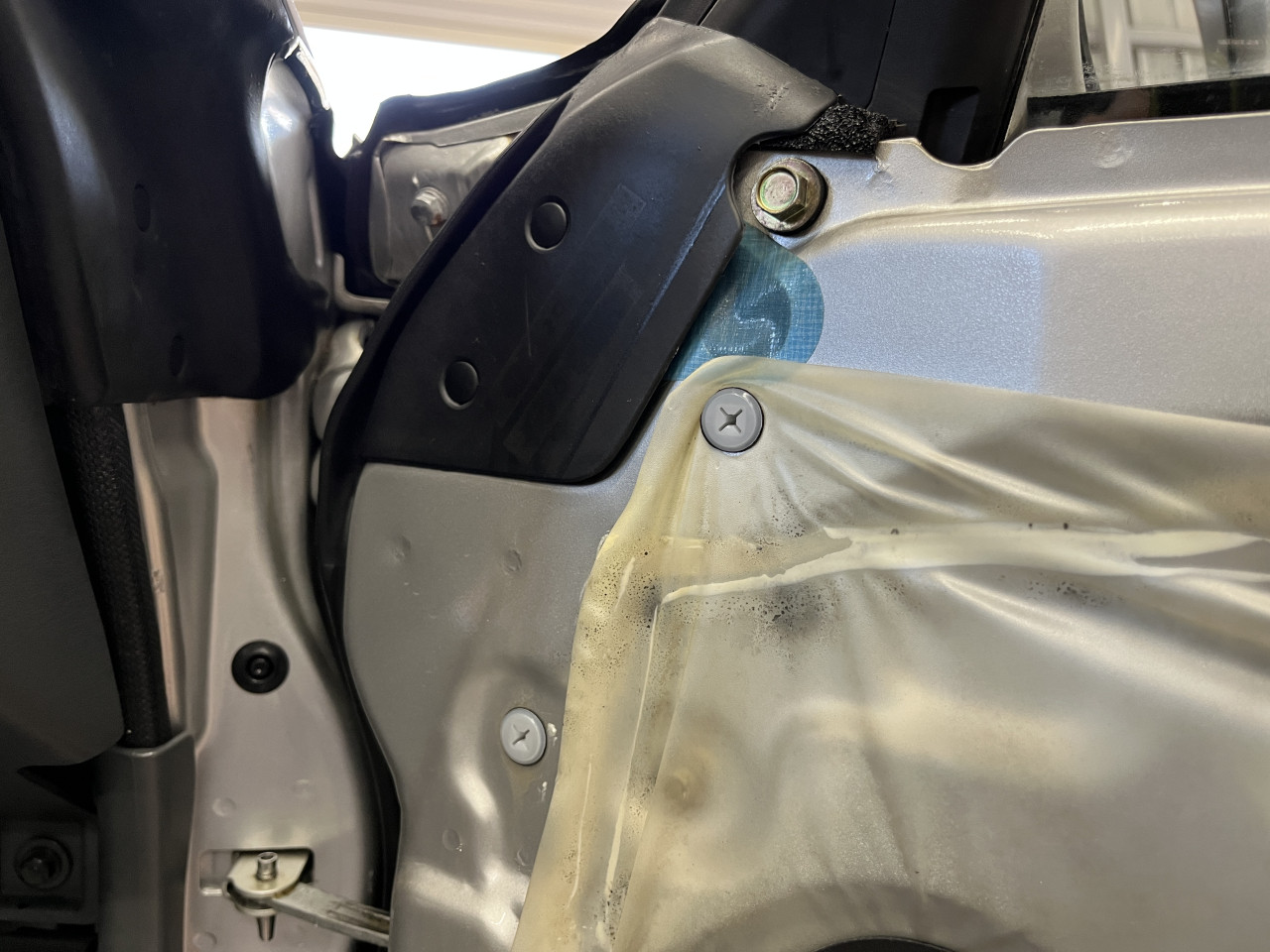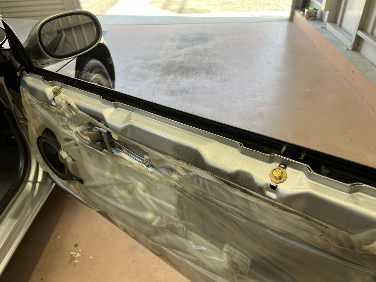 グロメット交換及びウィンドウスタビライザー調整作業もOKですので、ドアライニングを元に戻し、ビスでしっかり固定すれば作業は完了です。