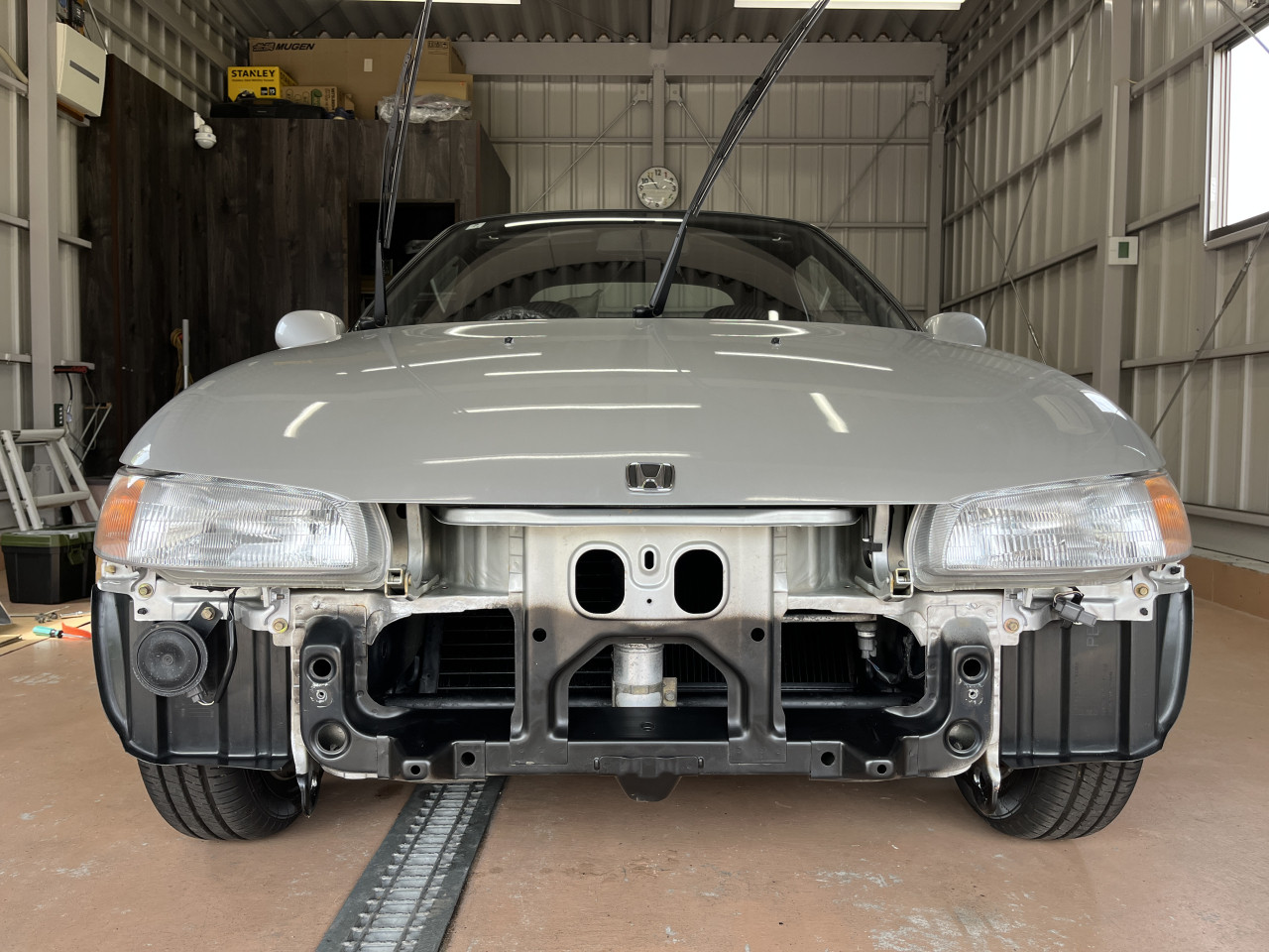続いては、バンパーを外してフロント廻り並びにリア廻りのボディーの状態確認及び各部清掃作業を行いましたが、作業の様子は次回にご紹介致します。