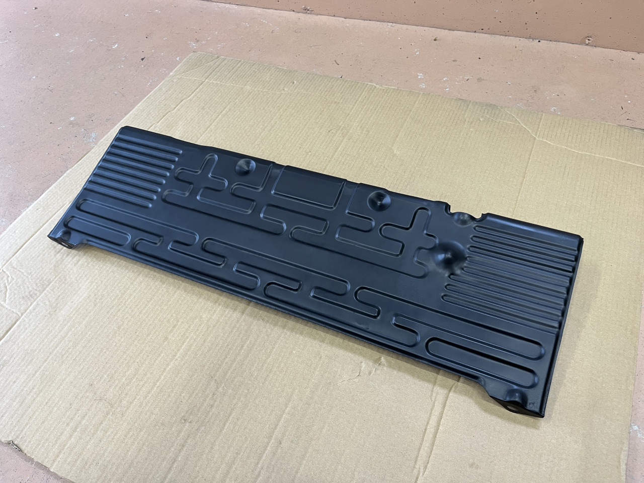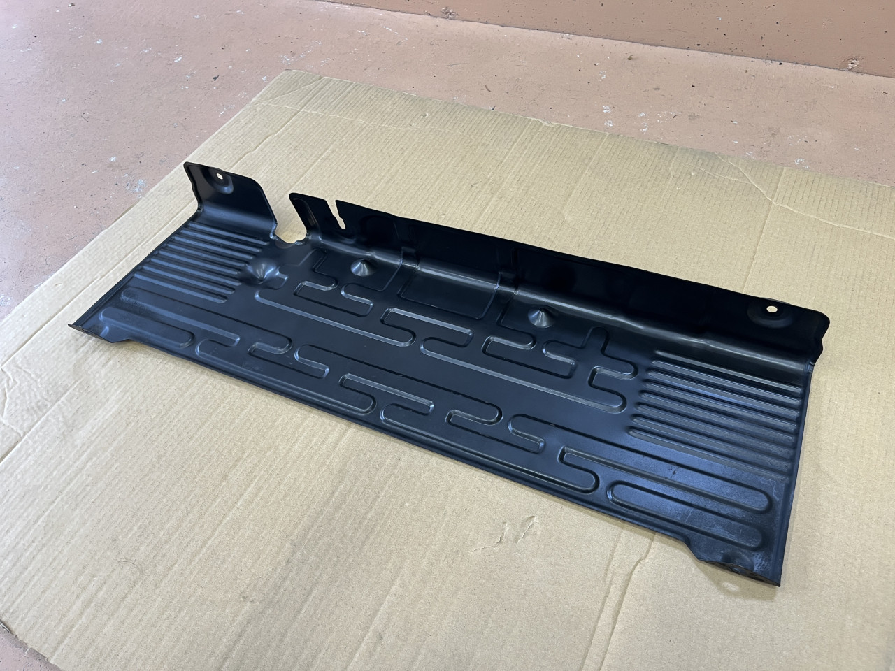 バンパーが外れましたら、トランクフロアやフレームの奥、マフラーの状態を確認するために、3本のボルトを取り外してマフラー遮熱板も取り外します。
