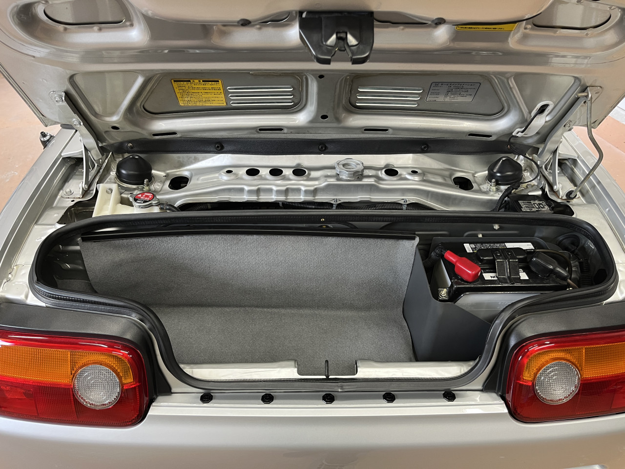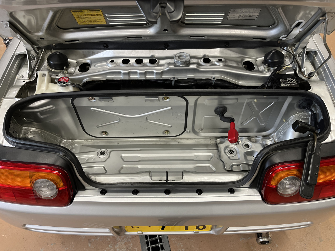 ここで修復歴有無の確認の一環としてトランクフロアの確認を行いますが、フロアに歪みや塗装跡が無く、車両後端のシーラーの状態も純正のままですので、リアにおいては事故歴や修復した形跡がないことが改めて確認できました。