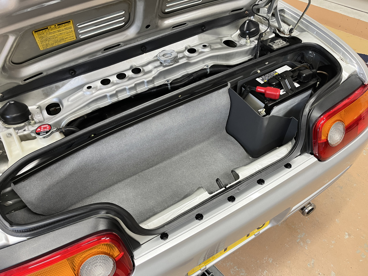 清掃を行うにあたっては、隅々まで綺麗にする為、そしてボディーのトランクフロア状態確認を行う為に、トランクマット、バッテリー、バッテリーケース、助手席側テールライトカバーなど全て取り外してから行います。