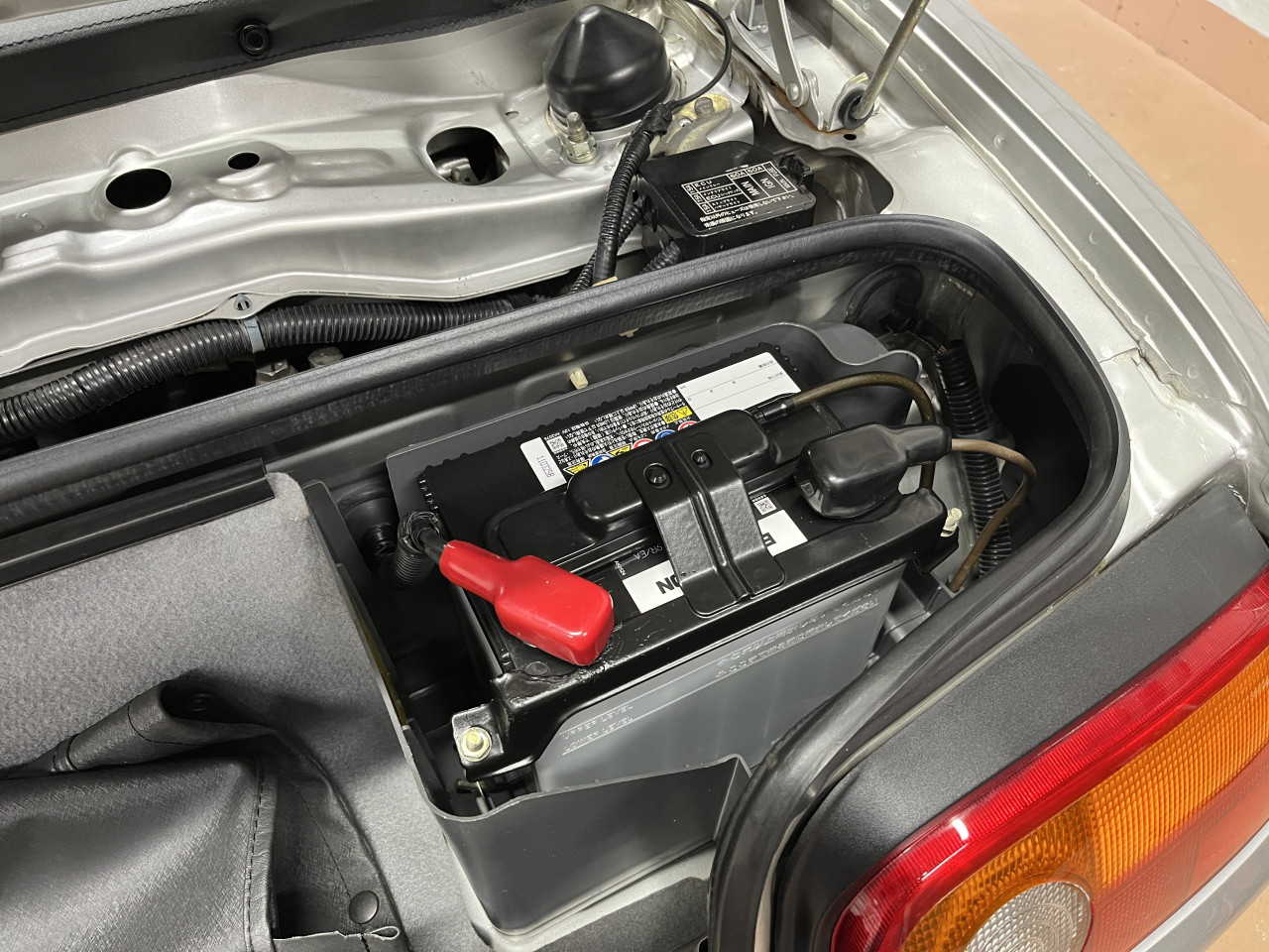 交換にあたりましては、販売メンテナンスにてバッテリートレイも清掃済みですので、プラスとマイナスの端子を取り外した上で、バッテリーを固定しているステーを取り外して新旧バッテリーを入れ替えた後、バッテリー固定ステーを取り付け、プラスからマイナスの順で端子を取り付けましたら作業は完了となります。