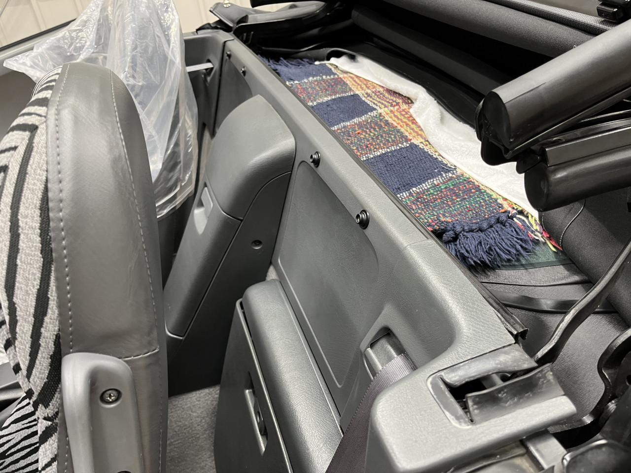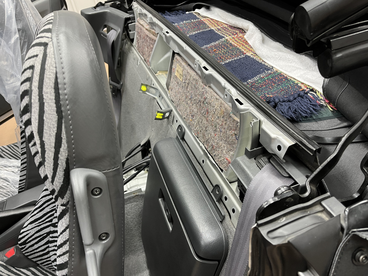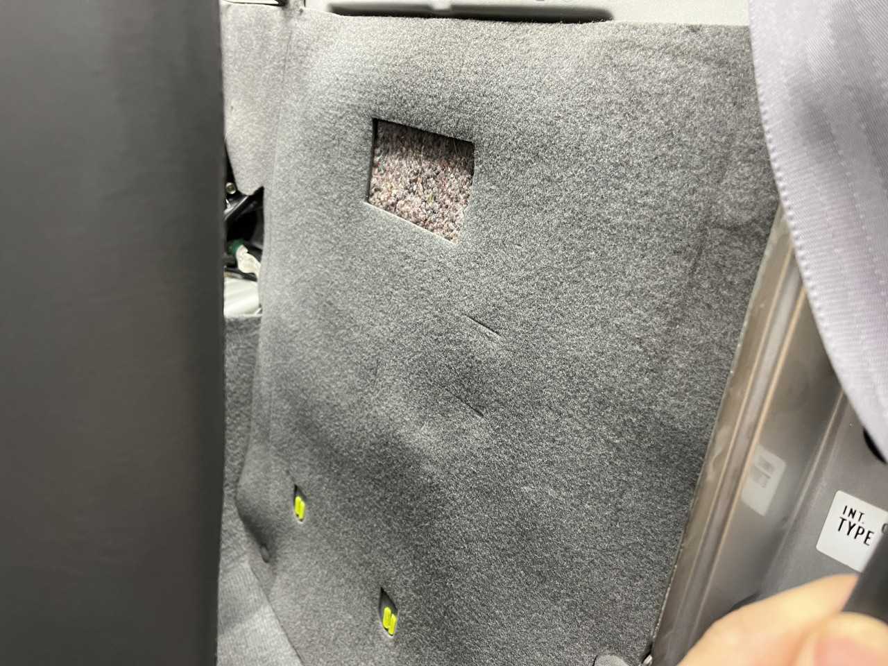 それでは、メインリレー交換作業に入りますが、メインリレーは助手席後ろカーペット裏側のリアバルクヘッド部分にある為、交換にはリア廻りのトリム類、ドキュメントボックスなどを外す必要があります。