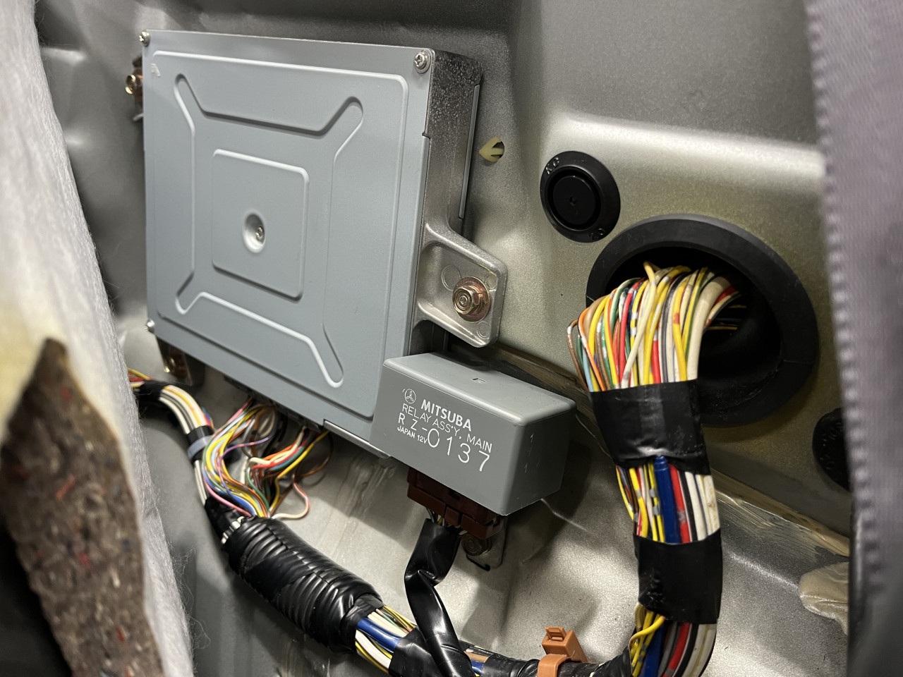 ドキュメントボックスまで取り外しましたら、助手席後ろのカーペットを留めているクリップ2つを取り外し、カーペットをめくると、ECUと今回交換するメインリレーが見えます。