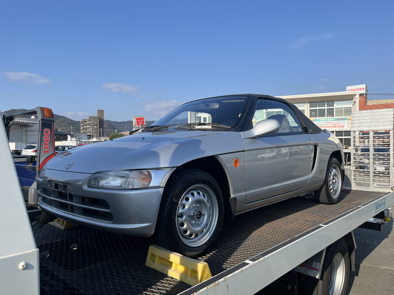 尚、ローダーはレンタルとなりますので、出発日の朝にレンタル業者様にローダーを受け取りに伺い、弊社に戻ってきてBEATを積載し出発となりますが、ご納車場所となる山口県までは片道約500kmとなりますので、山口県にて前泊し、翌日にご納車という日程となります。