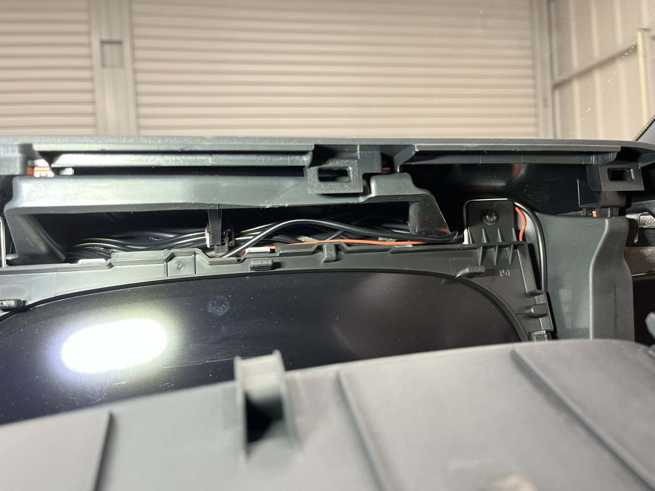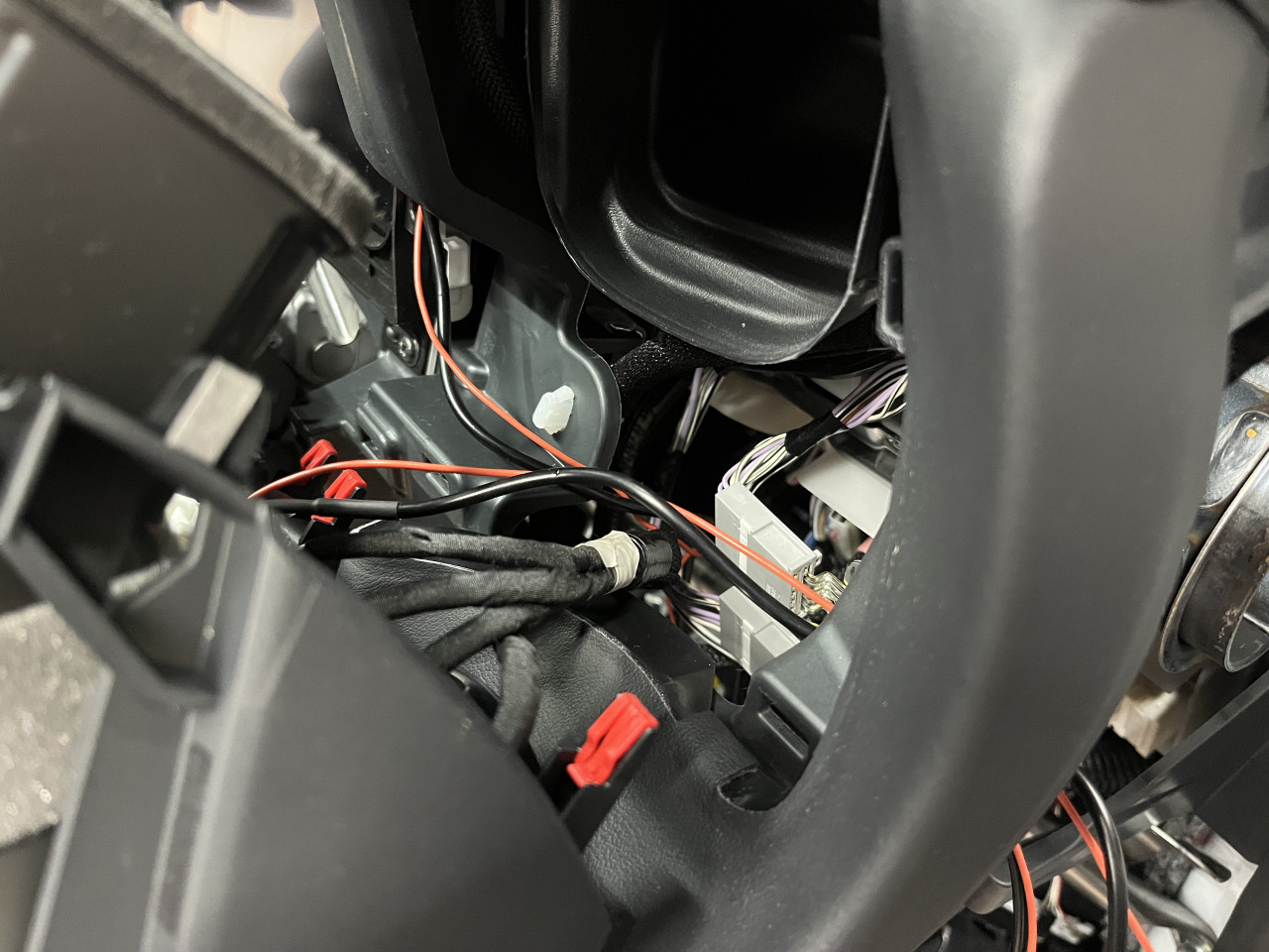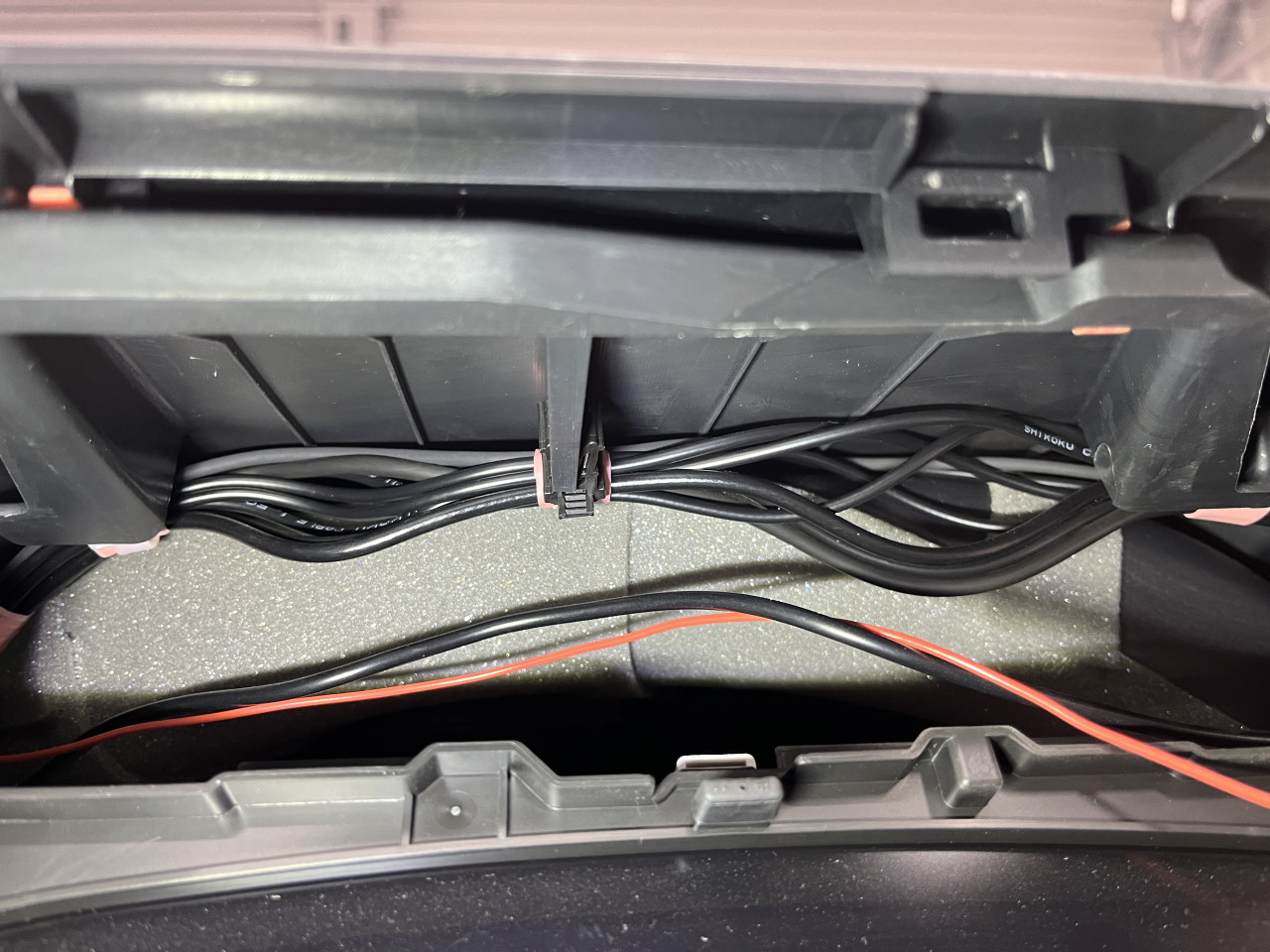 これでメーターパネル部分の対策はOKですので配線が動かない様に工夫(純正ハーネスに固定)をした上でメータパネルを取り付け、続いてメーター右側インパネ部分における配線の対策を行います。