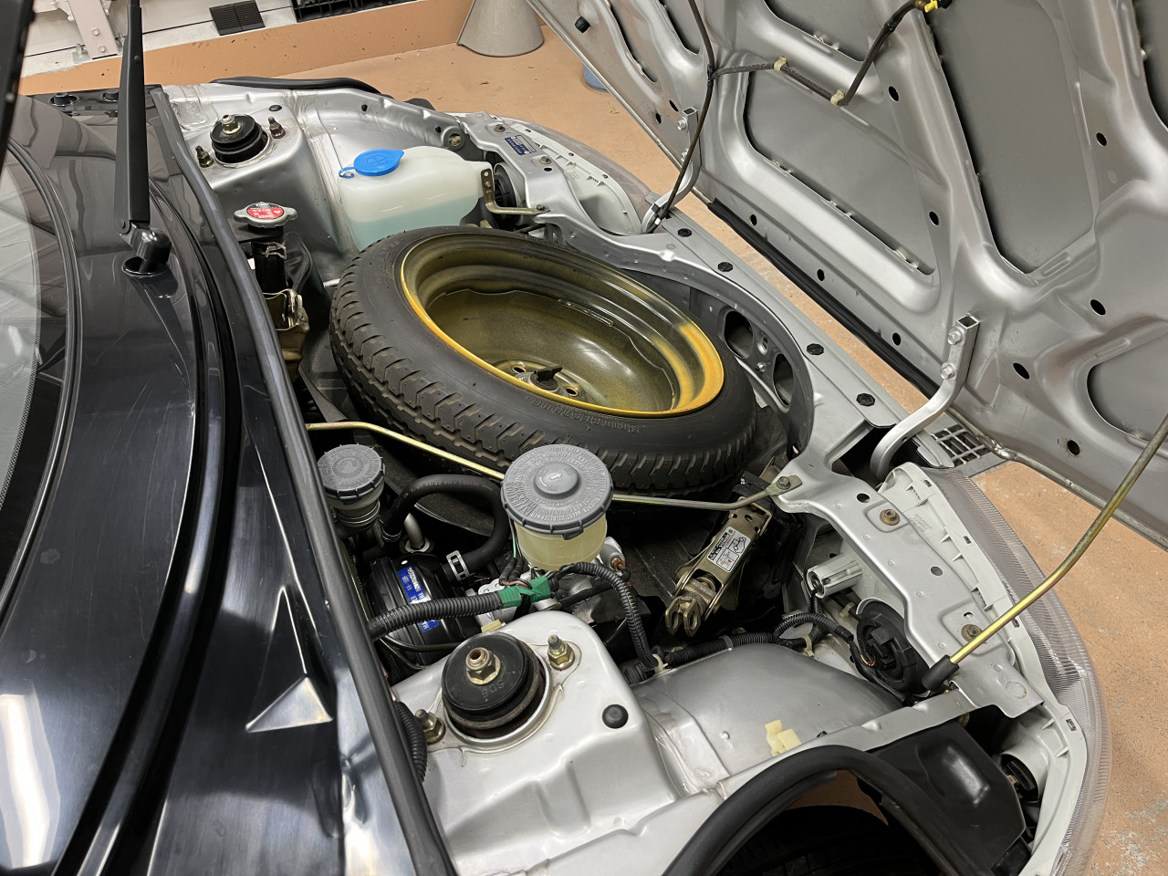 スペアタイヤとフロアジャッキを元に戻せばフロントボンネット内の作業は完了となります。