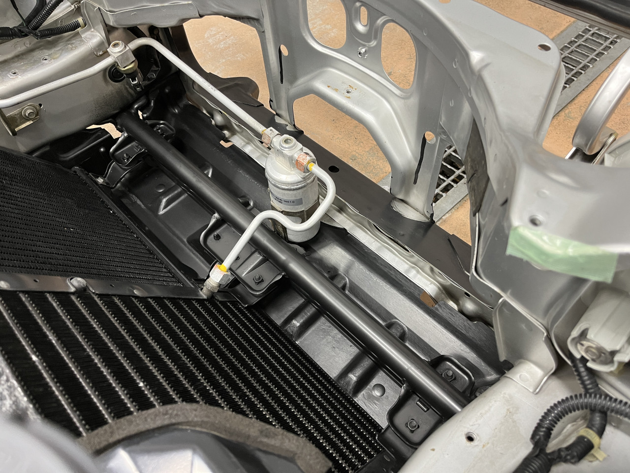 各部綺麗になりましたら各部状態確認を行いますが、フレームはもちろんのこと、フロントクロスビームやコンデンサー、エアコンレシーバータンクなどの錆が少ないことが確認でき、予想通り状態の良いフロントボンネット内であることが確認できました。