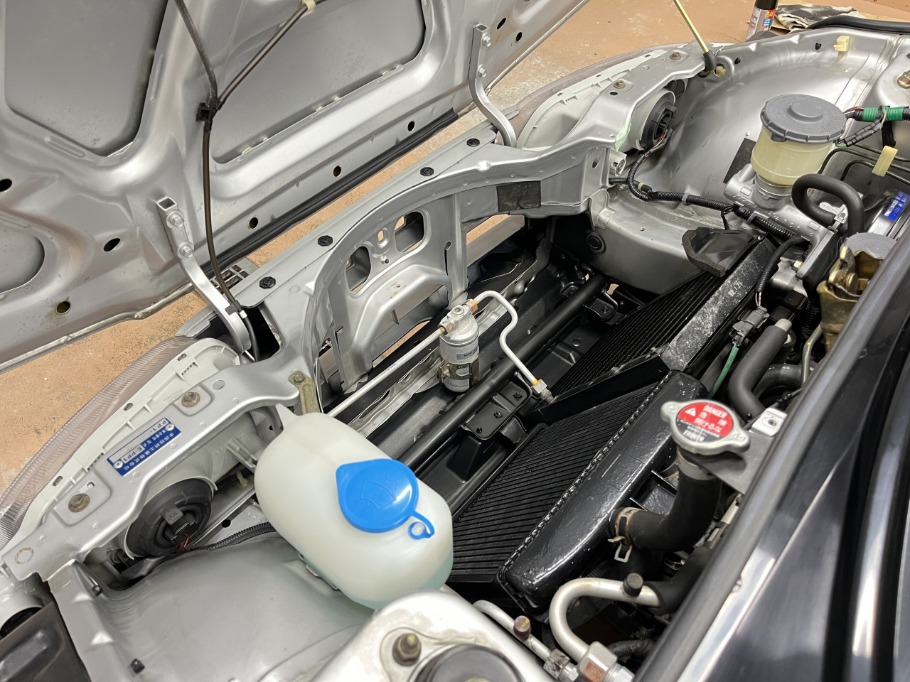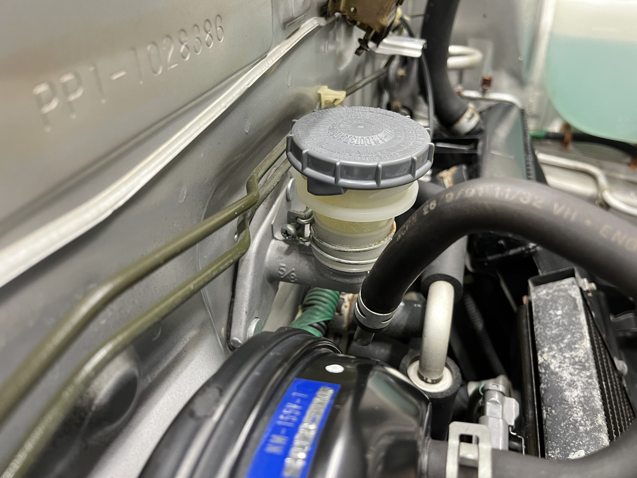 因みに、フロントボンネット内では、ラジエター、ラジエターファン、モーター、各種ホース類といった冷却系関連、そしてブレーキマスターシリンダー、クラッチマスターシリンダーが交換済のため、実際に良好な状態であることが確認できます。