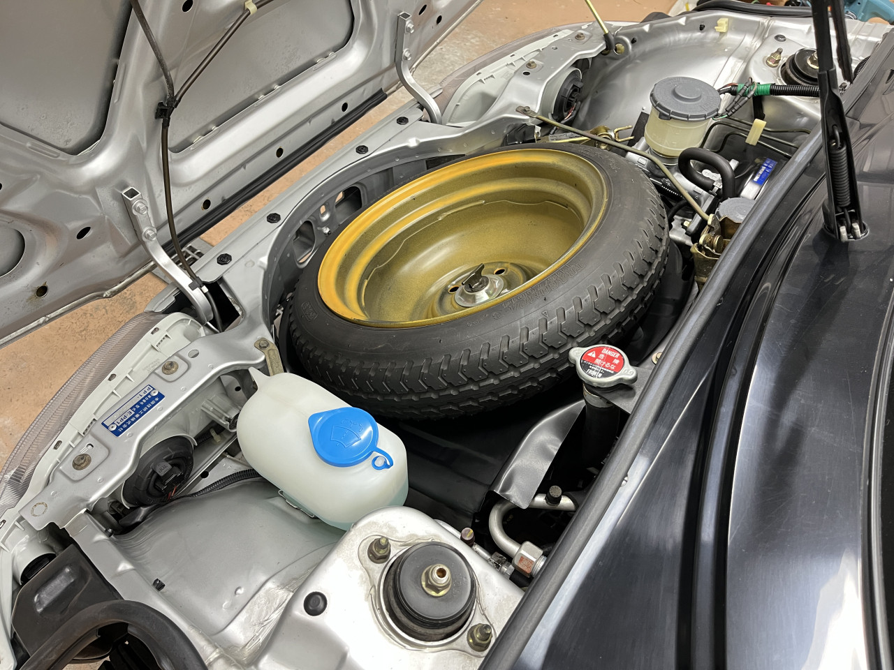 上記の様に綺麗なボンネット内ではありますが、スペアタイヤフロアパンの下側(フロントクロスビームなど)の状態はフロアパンを外さない限り確認ができませんので、スペアタイヤ、スペアタイヤフロアパンまで外して各部確認と普段清掃できない部分まで徹底的に清掃を致します。