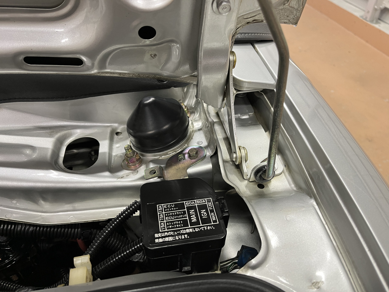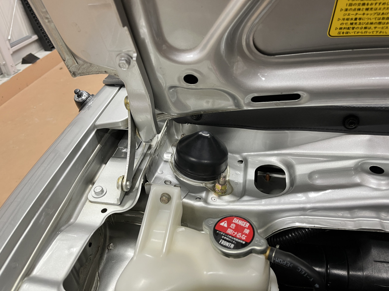 清掃前においても、年式相応のホコリの付着はありますものの、各パーツやステー類、ボルト、ナットなど各部の錆が少ないことがパッと見ただけでもわかるボンネット内です。