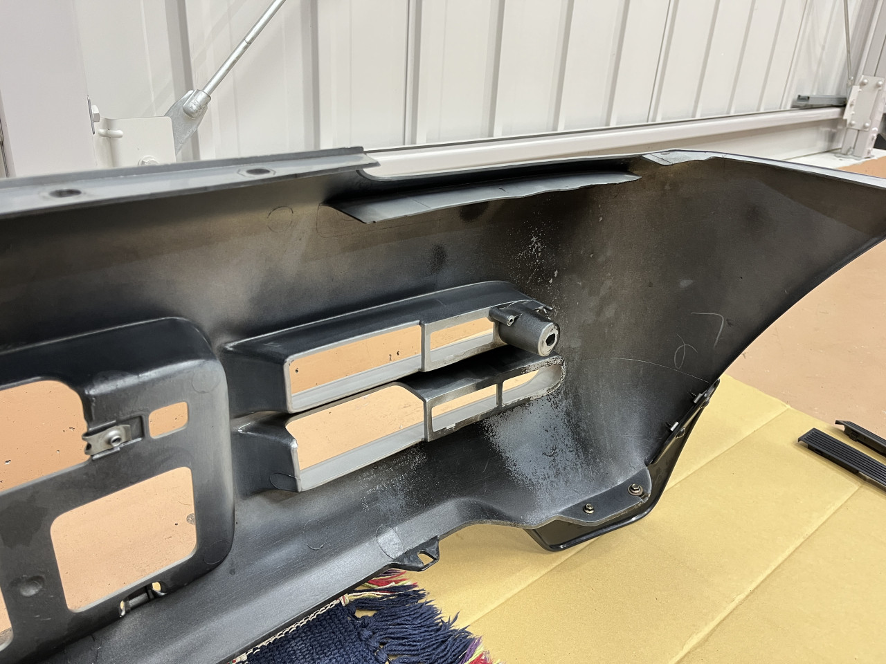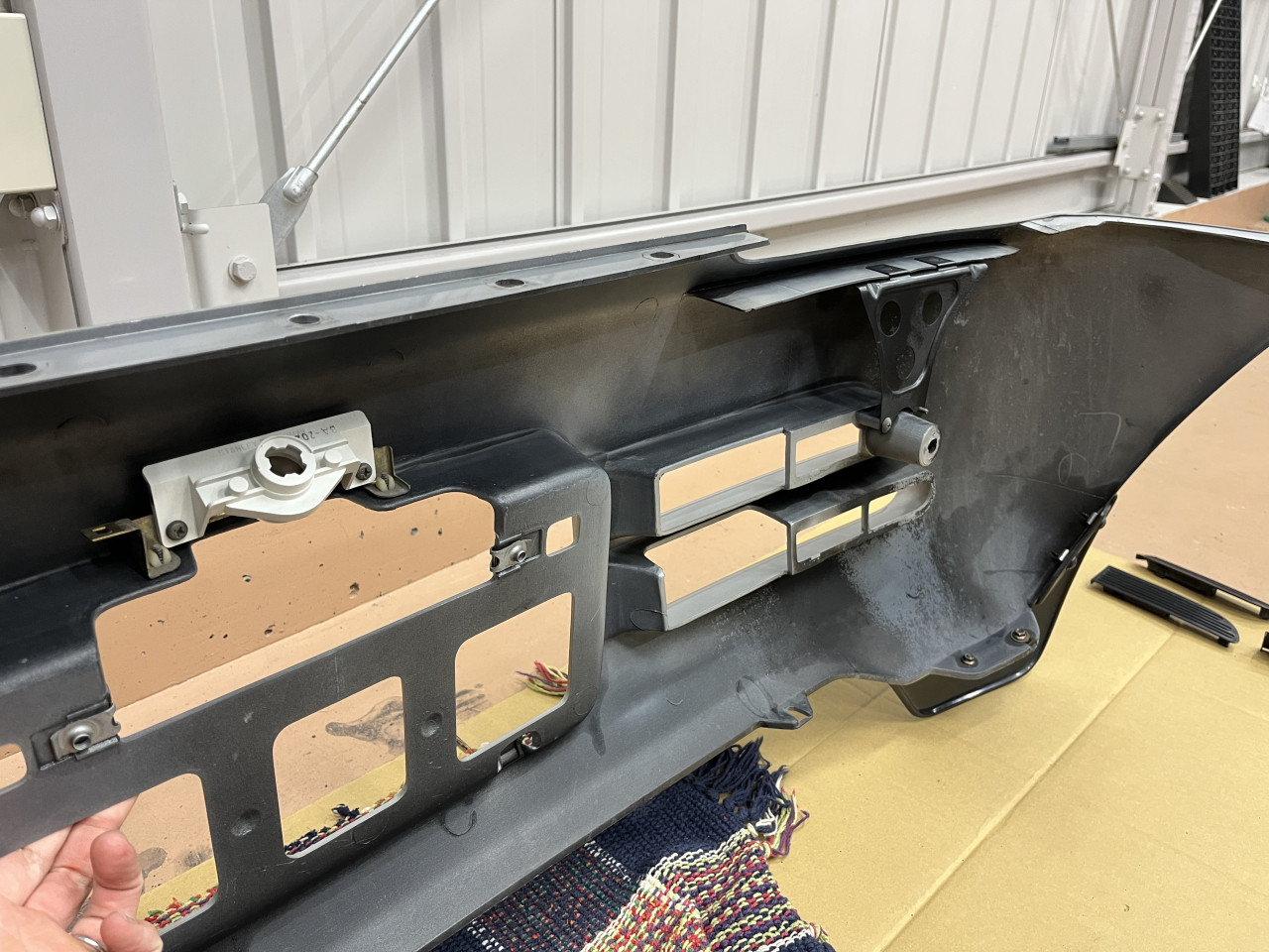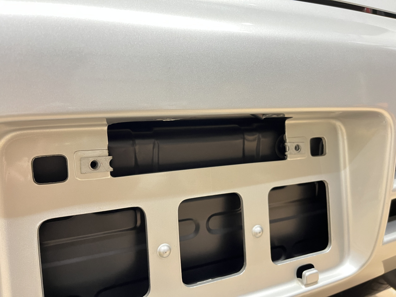 では早速確認作業に入りますが、ガーニッシュに隠れた正面左右のボルト2本と底面にあるクリップ2ケ、バンパー両端のビス2本、そしてバンパー上部のクリップ5ケとライセンスランプの配線を外し、リアバンパーを外します。
