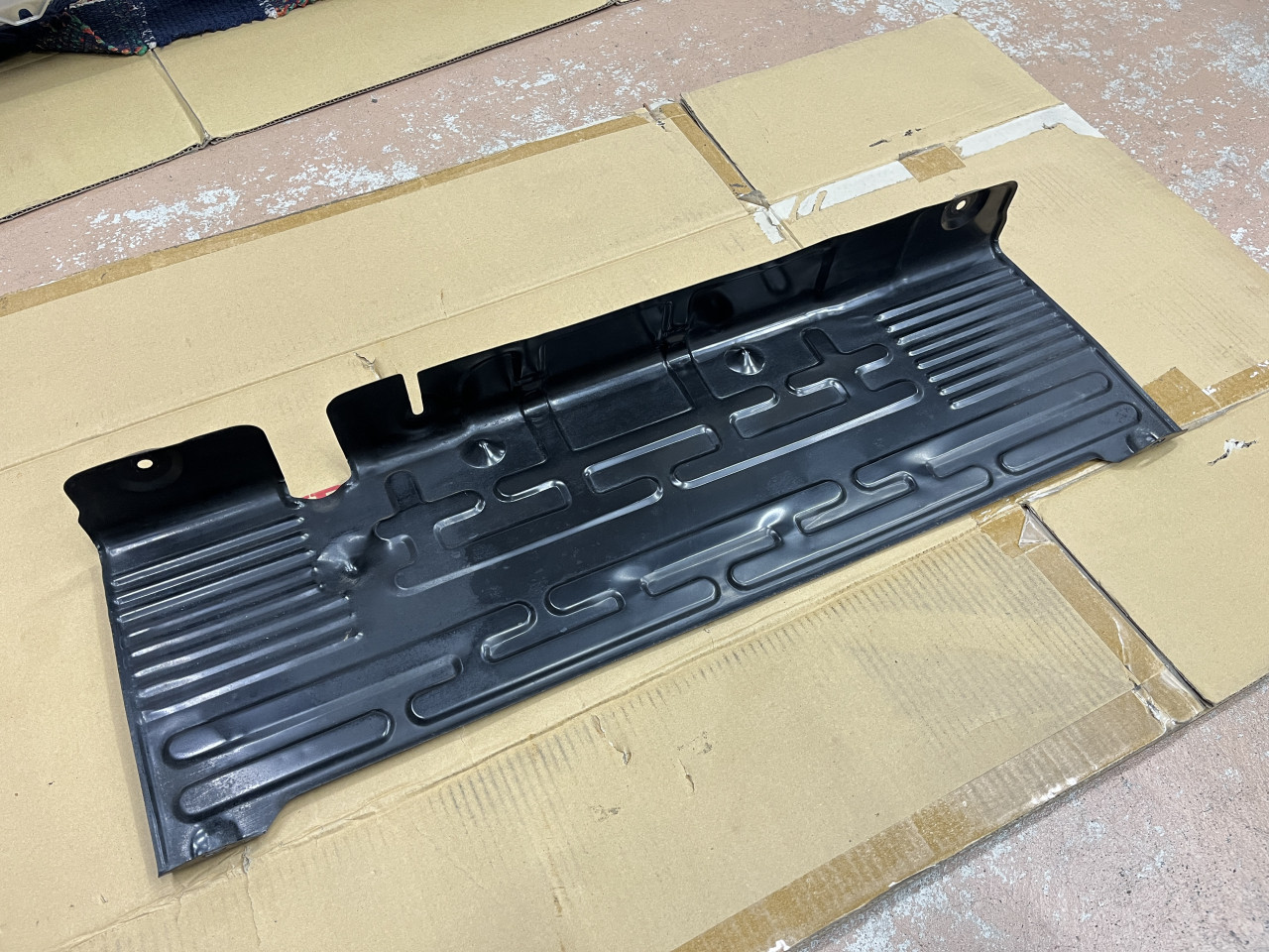 バンパーが外れましたら、トランクフロアやフレームの奥、マフラーの状態を確認するために、3本のボルトを取り外してマフラー遮熱板も取り外します。