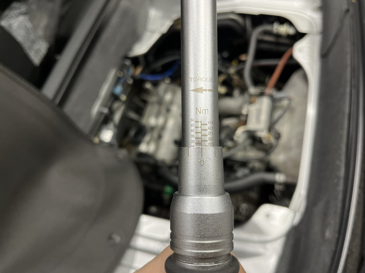 確認が終わりましたらプラグの取り付けを行いますが、BEATのシリンダーヘッドはアルミ製でオーバートルクはネジ山を舐めて取返しの付かないことになってしまいますので、しっかり本プラグの規定トルクの27.5N・mで締め付けを行います。