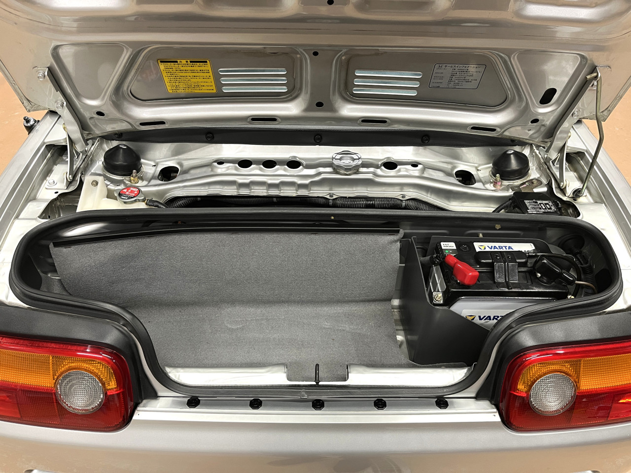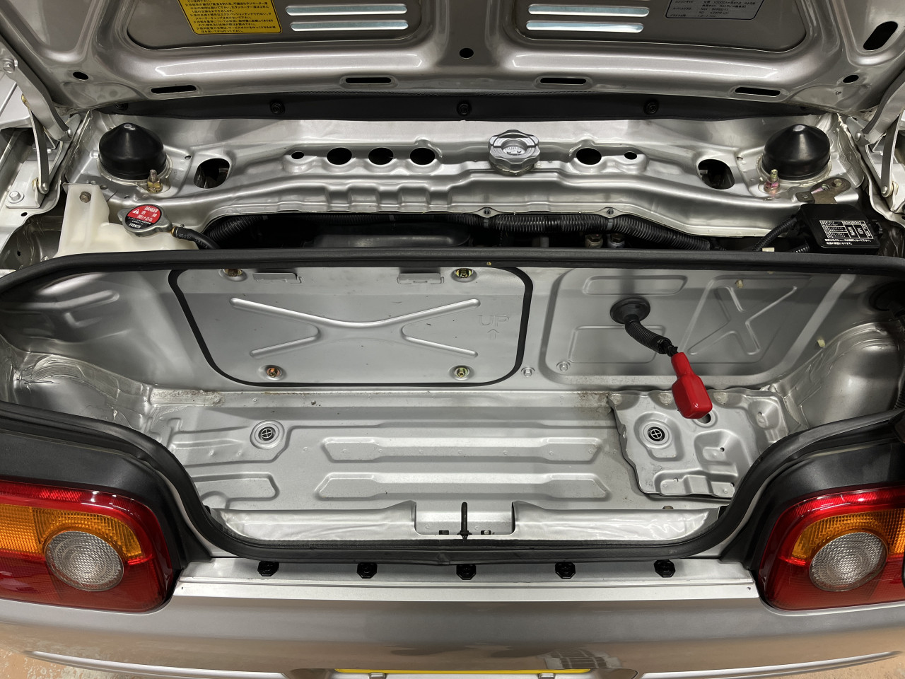 ここで修復歴有無の確認の一環としてトランクフロアの確認を行いますが、フロアに歪みや塗装跡が無く、車両後端のシーラーの状態も純正のままですので、リアにおいては事故歴や修復した形跡がないことが改めて確認できました。