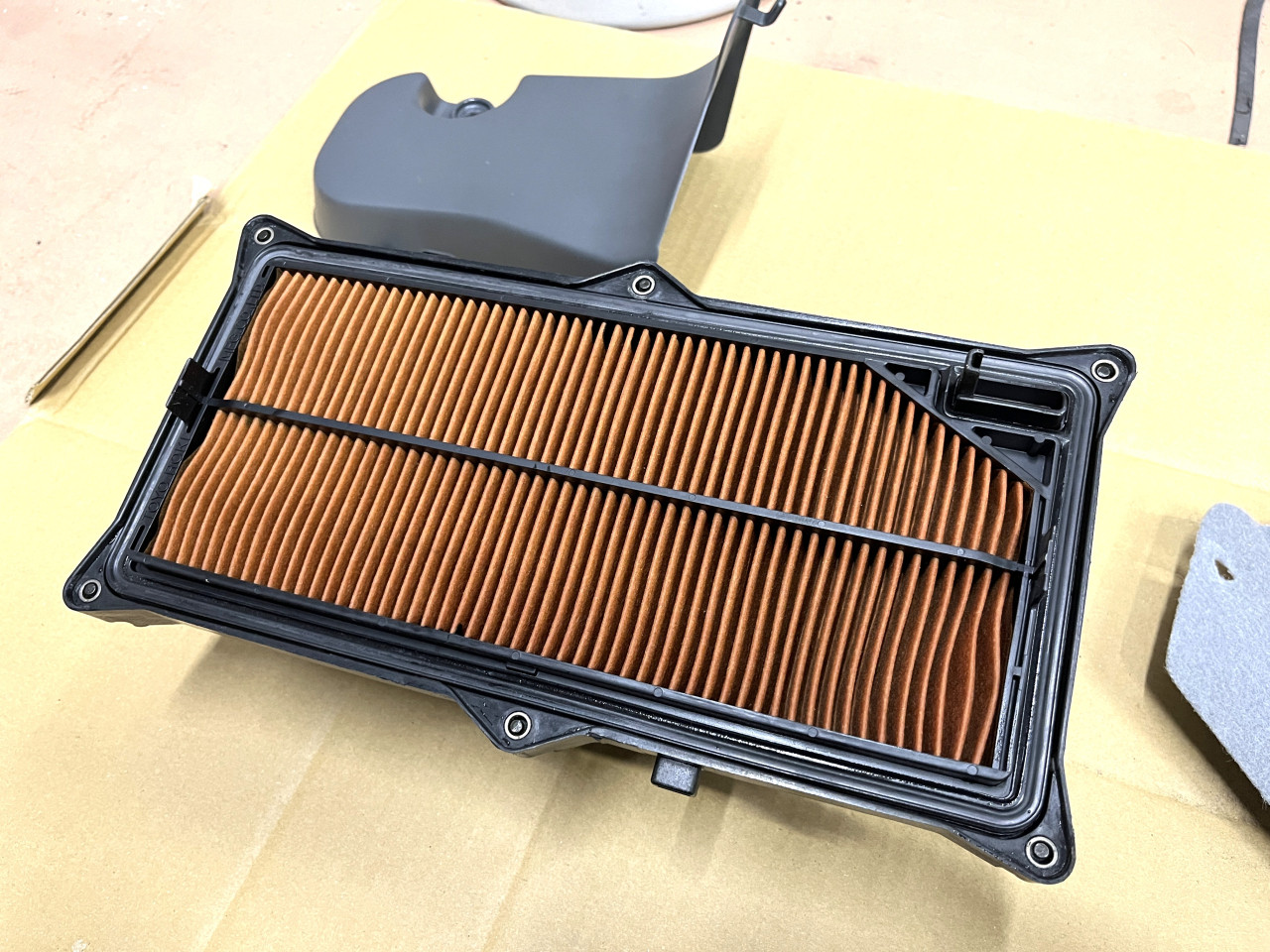 そして、手の届く範囲で周辺の清掃を行った後に、エアクリーナーケースカバーを固定している6本のビスを緩めてエアクリーナーエレメントと共にカバーを取り外しますと、ようやく今回の目的であるエアクリーナーケース内部を確認することができます。