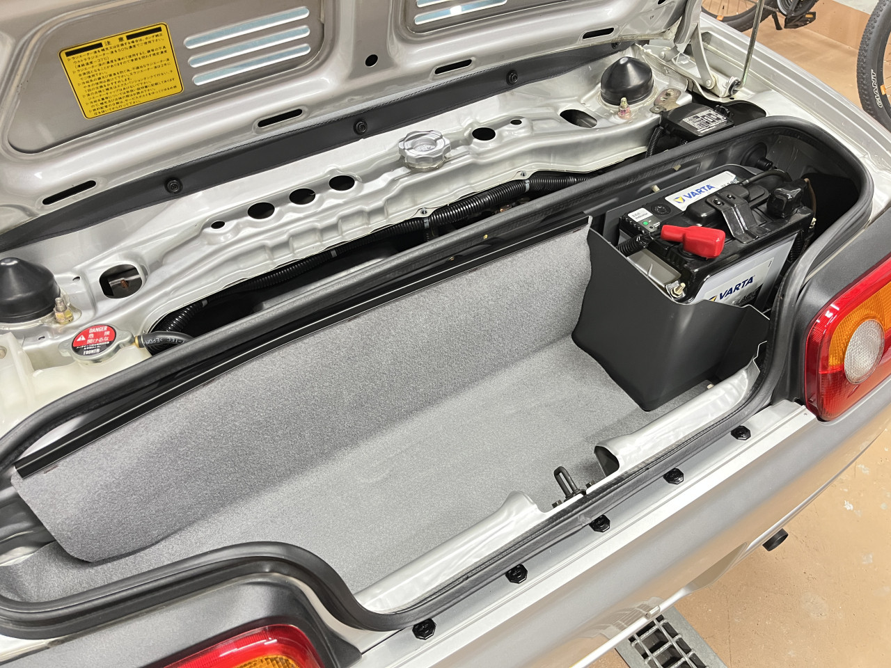 そして清掃に入りますが、特にトランクルームの端はバッテリーなどを外さないと手が入らないところで、通常はホコリや汚れなどが多く堆積しているものですが、本車両は清掃前でも凄く綺麗です。