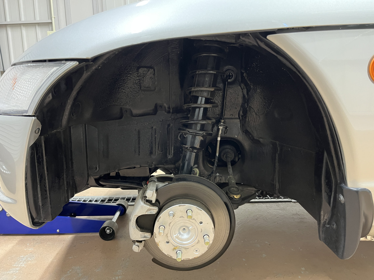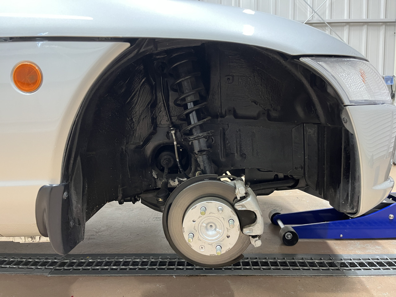 前回はブローバイガス状態確認の様子をご紹介致しましたが、今回は【足廻り状態確認①】として、フロント側におけるホイールハウス内清掃をはじめ、サスペンションやアーム類の清掃・状態確認及びゴム類やブレーキパッドの残量確認の様子をご紹介致します。