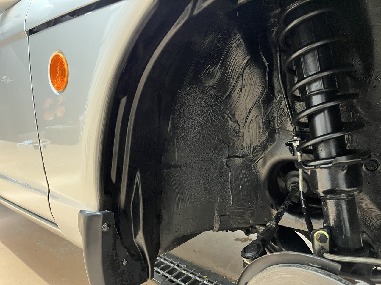 一通り確認致しましたら、清掃にて砂ホコリなど軽微な汚れを落とし、樹脂のインナーフェンダーなどに保護剤を塗り込んでおきます。