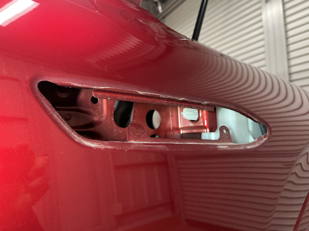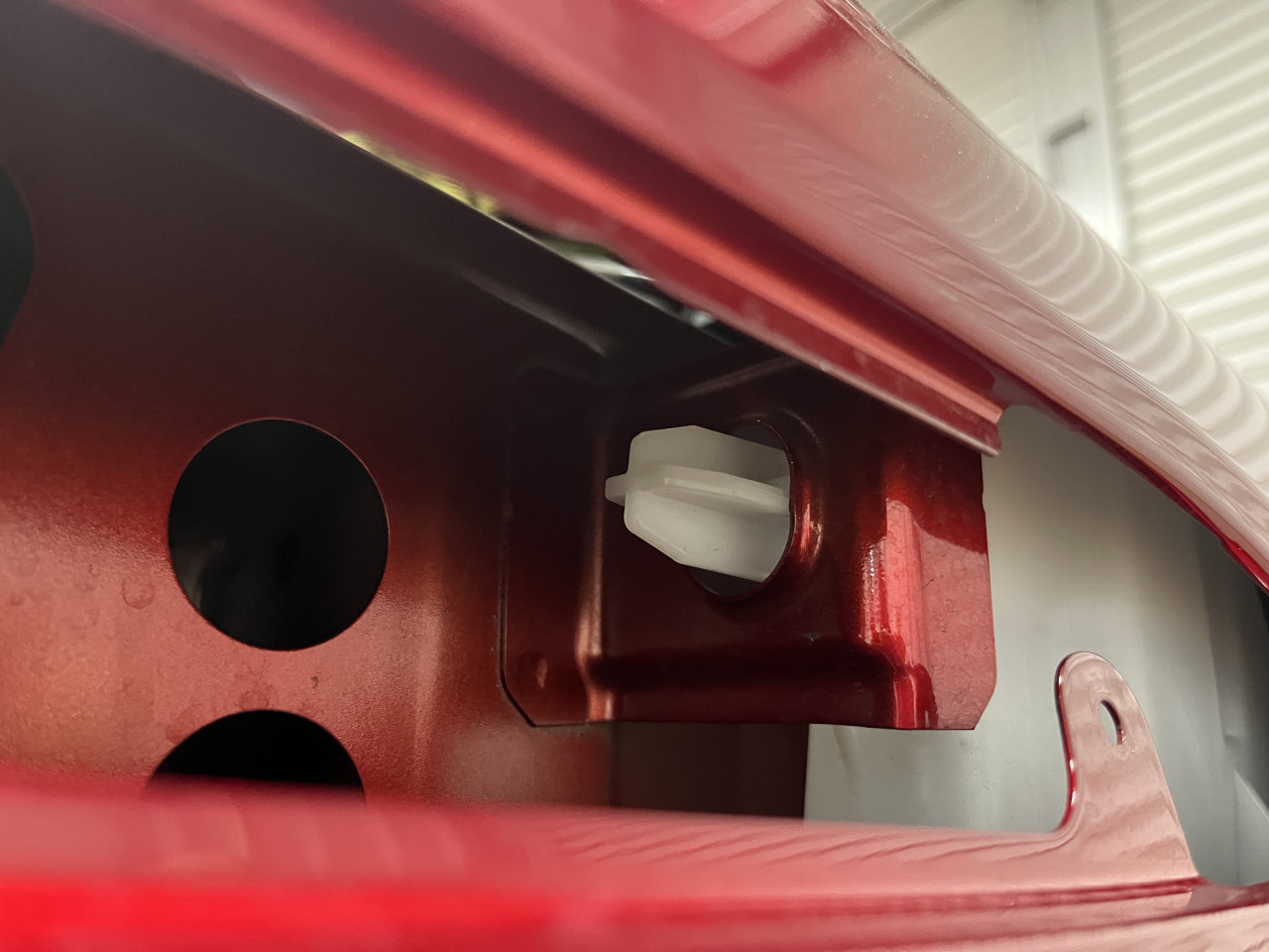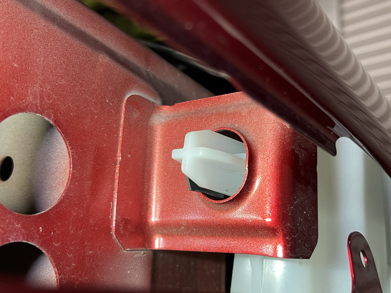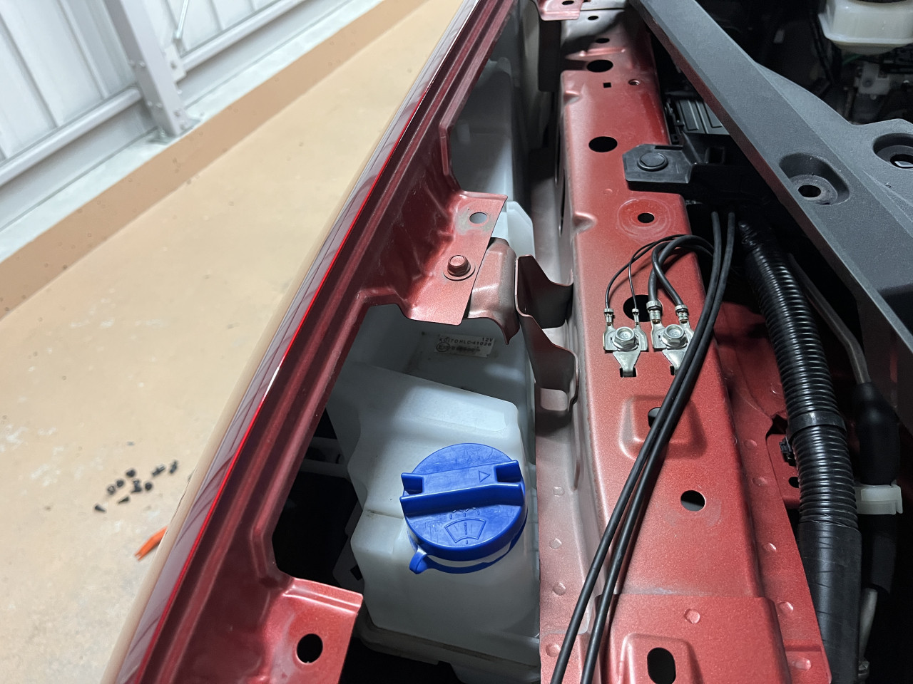 ウォッシャータンク奥の位置決めロッドがボディーパネルの穴に入る様になっているのですが、このロッドと穴にガタがあり、ウォッシャータンクを揺すると音が出るのですが、穴側のボディーパネルがバルクヘッドと繋がっているので、音がパネルを伝わり室内に入ってきていると推測できます。