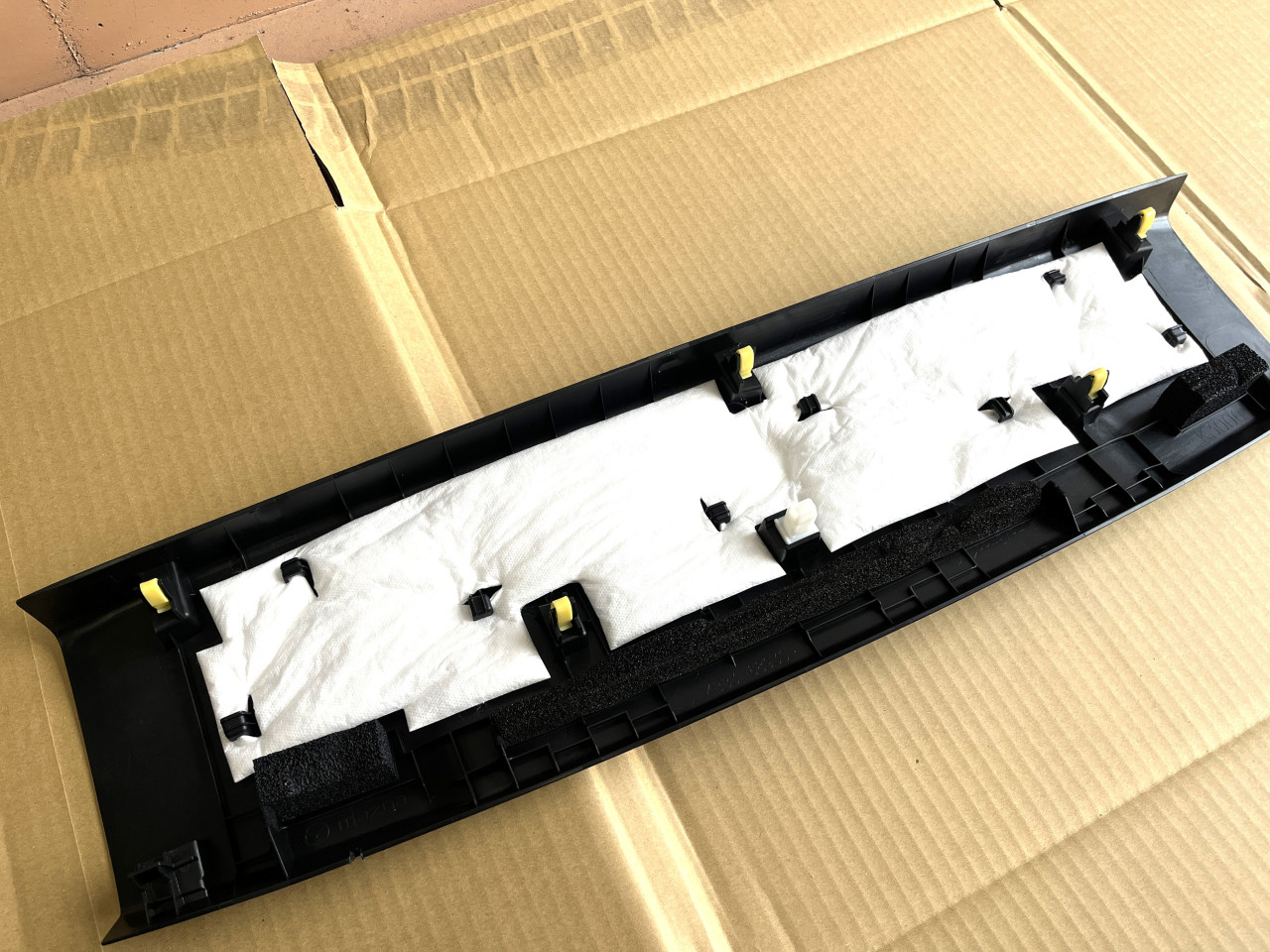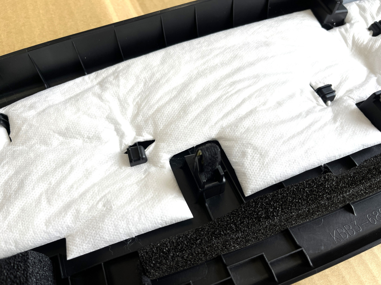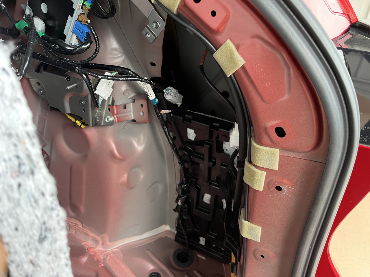 バックドアライニングは手で叩くと車体パネルと接触してビビリ音が出ておりましたので、接触する部分に緩衝材を貼り付けて対策します。