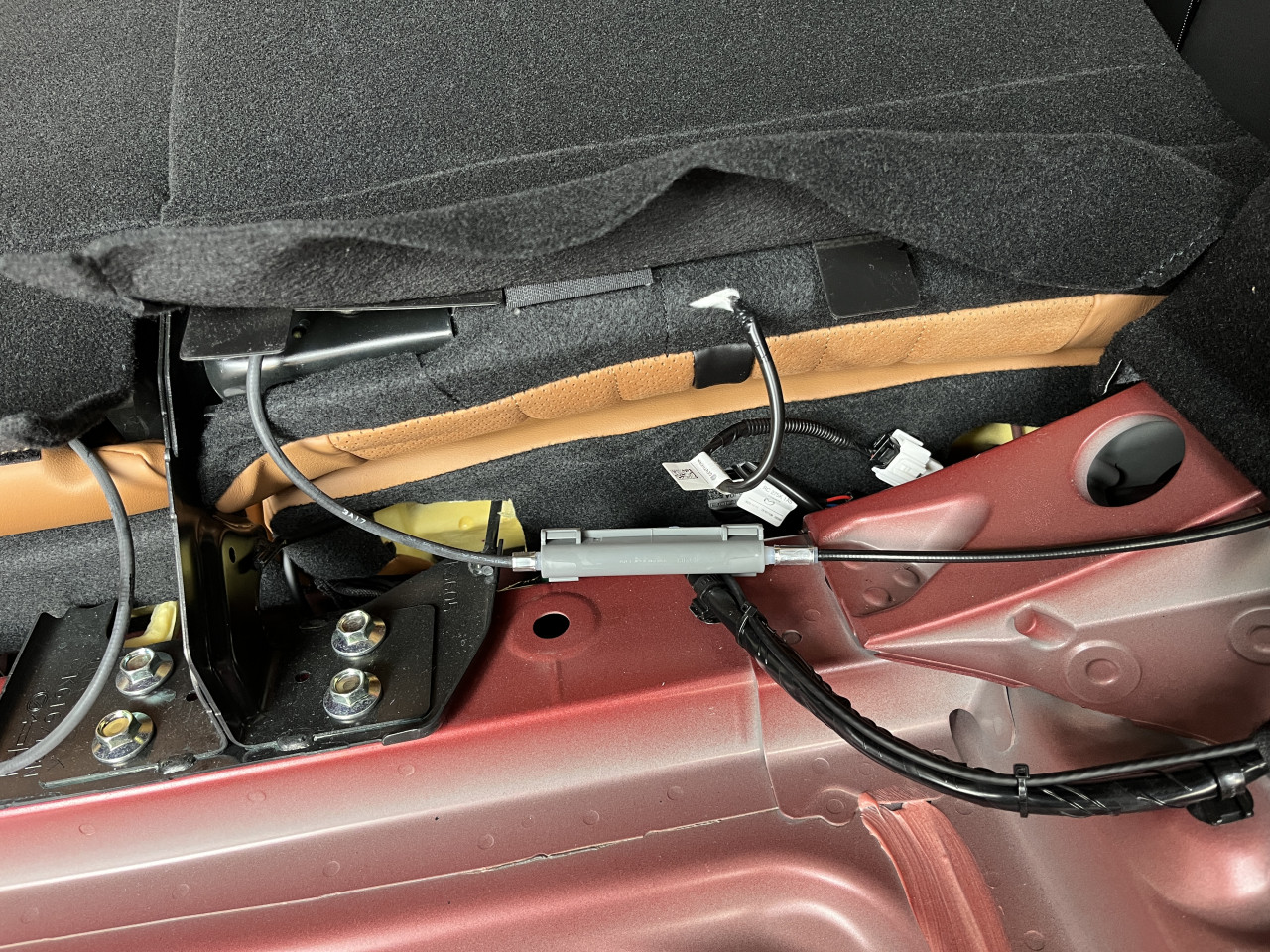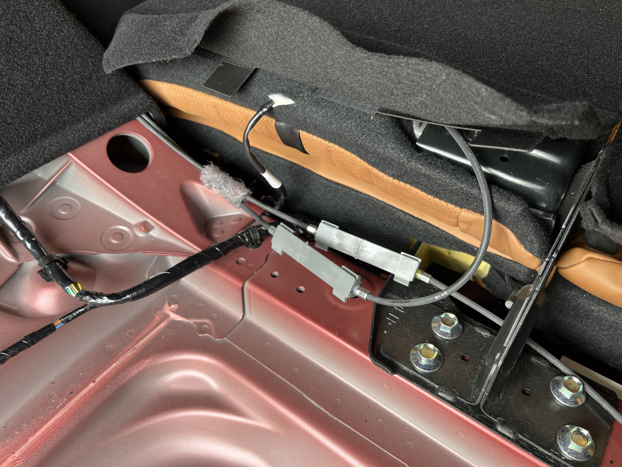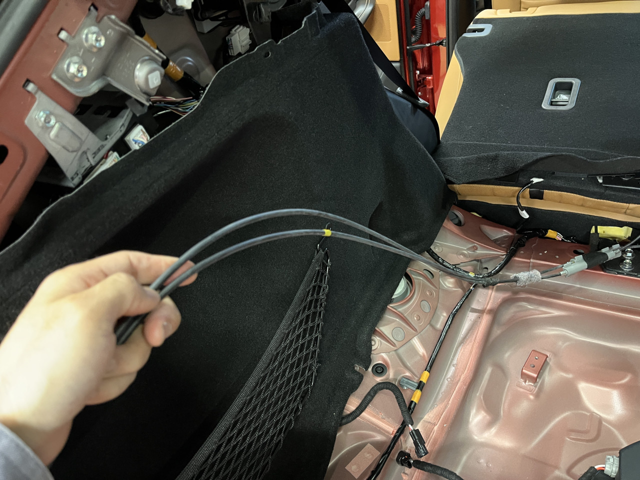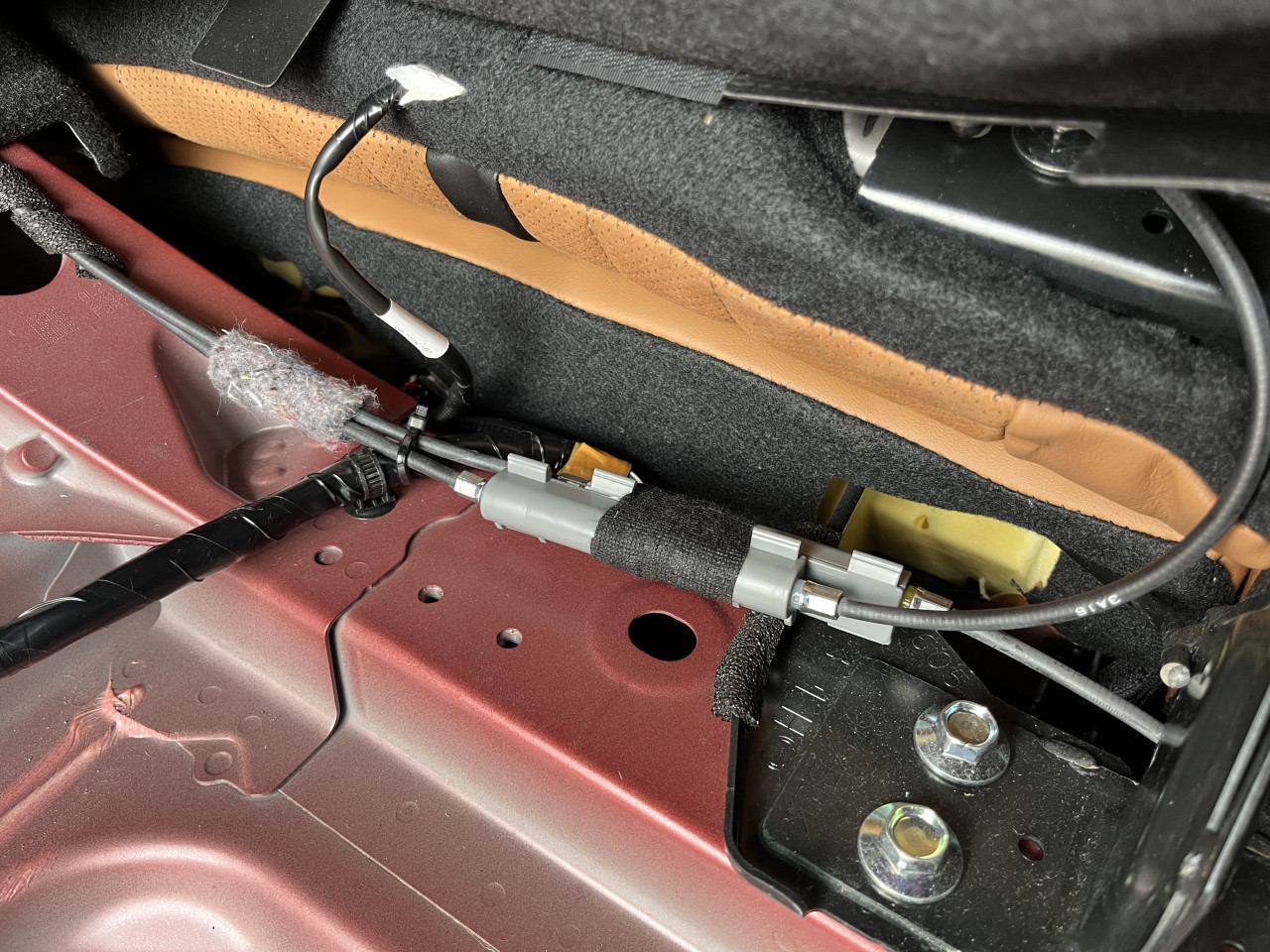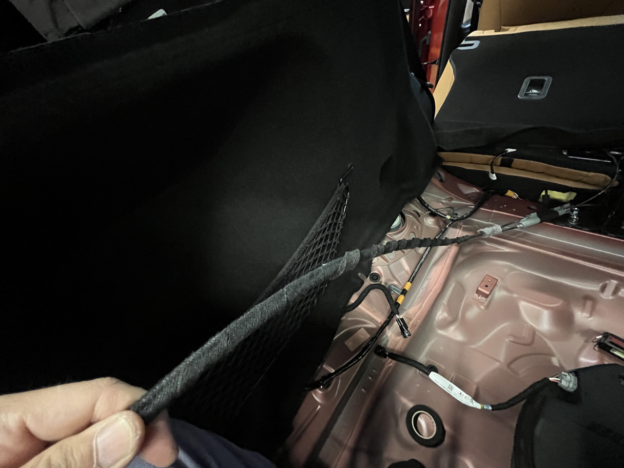 ここで試走、、、といきたいところですが、このグレーの樹脂パーツの対策を行っている時に、ケーブルを動かすと助手席側のラゲッジルームライニング内部から『コトコト』とライニングとケーブルが当たる音がします。